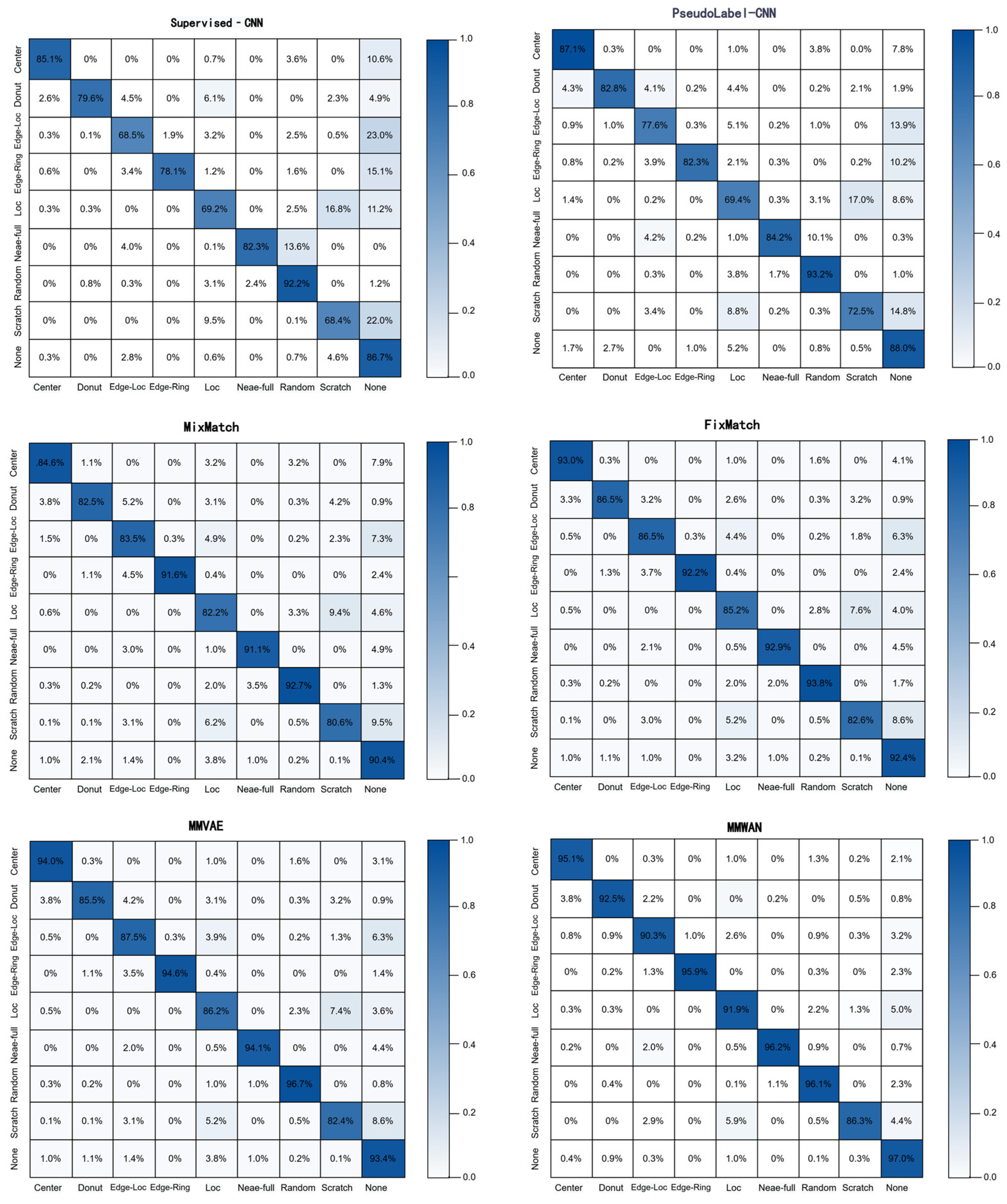 Figure 6 shows the confusion matrices for the evaluated models at the 5% labeling ratio, taking the experimental run with the random seed of 2026 as a representative example. Supervised-CNN and Pseudo-Label-CNN show high diagonal accuracies for majority classes (e.g., Center, Donut) but exhibit noticeable misclassification for defect types with fewer samples and more confusable patterns, like Scratch and Loc. While FixMatch and MMVAE strengthen the diagonal for most classes, MM-WAE shows the strongest diagonal in the confusion matrix, with marked improvements in the classification of minority classes. This suggests that MMD-based Wasserstein autoencoder regularization enables MM-WAE to more effectively capture the latent structure of unlabeled wafer maps, enhancing the discriminability of representations and the robustness of decision boundaries.