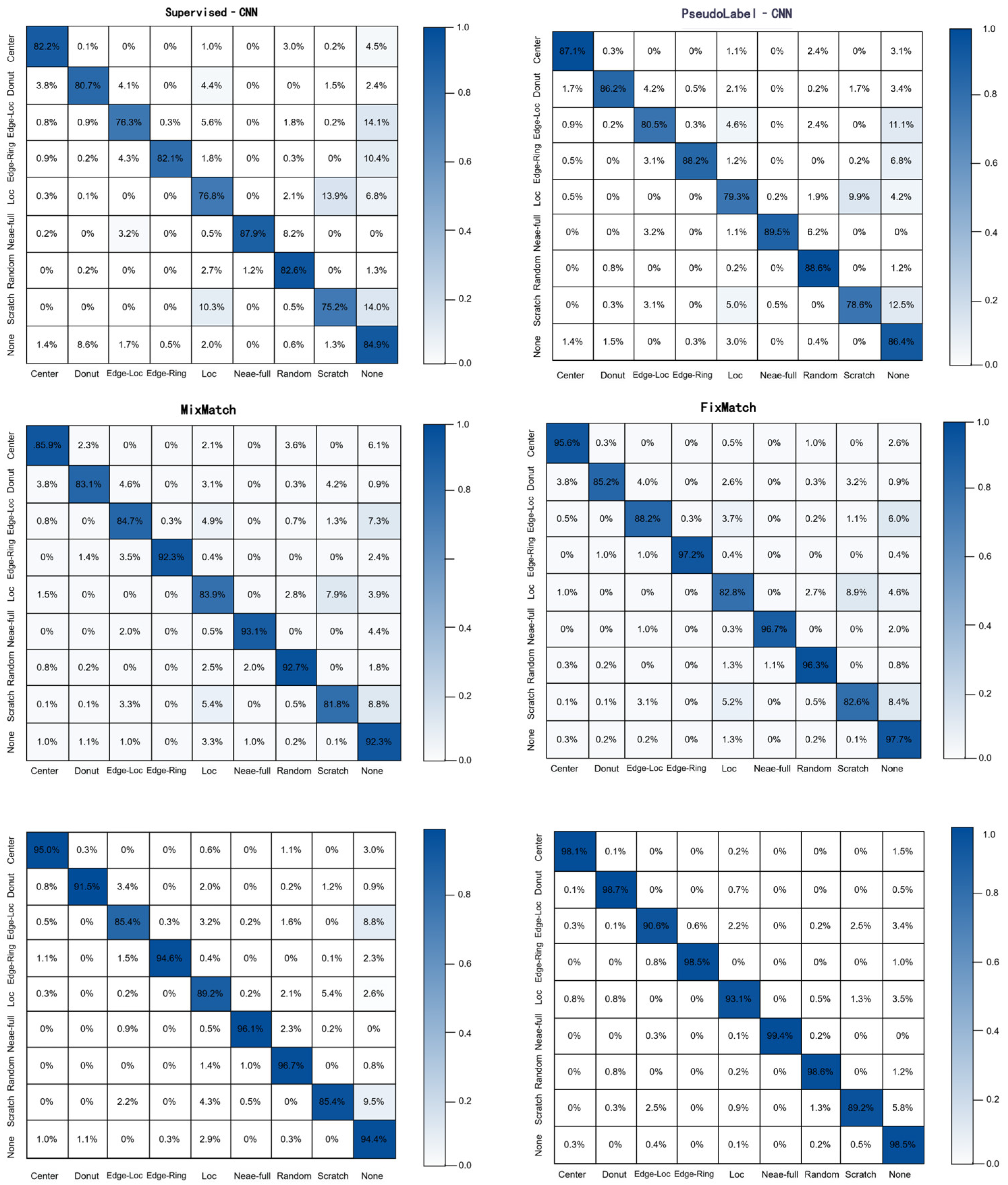 Pseudo-Label-CNN: a discriminative pseudo-label semi-supervised baseline, sharing the same architecture as Supervised-CNN. During training, we pretrain an initial classifier on the ρ fraction of and use it to predict labels for samples in . Samples with prediction confidence above a threshold τ are assigned pseudo-labels and added to the labeled training set, with model parameters updated iteratively. Pseudo-Label-CNN is used to evaluate the applicability of classical pseudo-label based semi-supervised strategies to the wafer defect classification task.