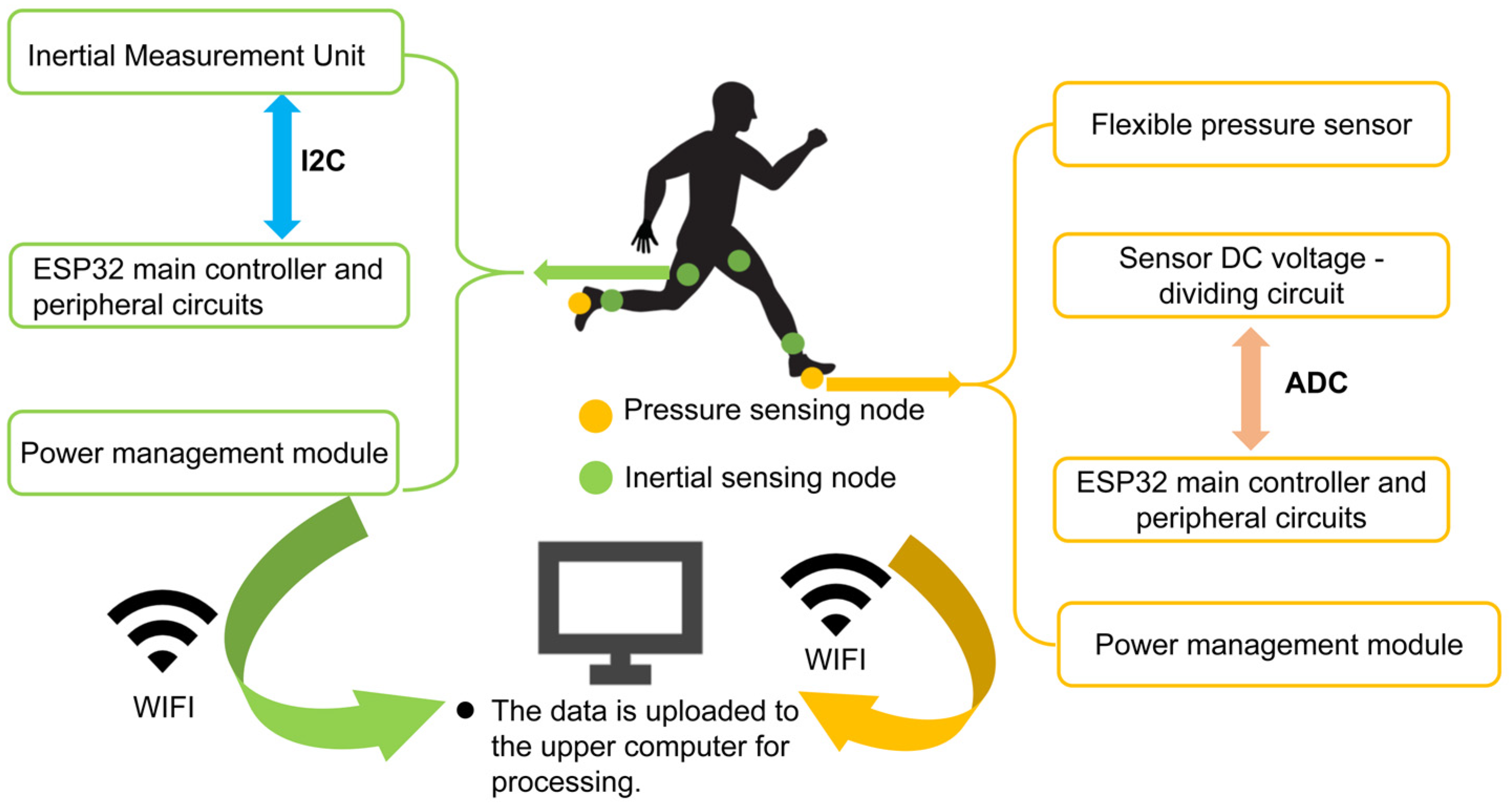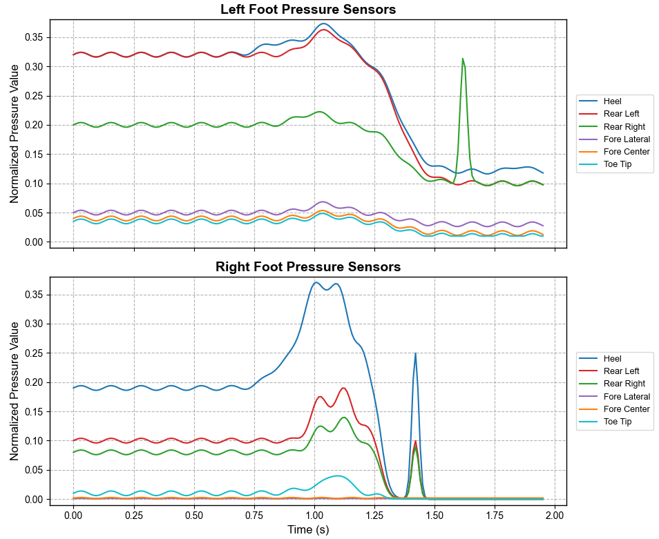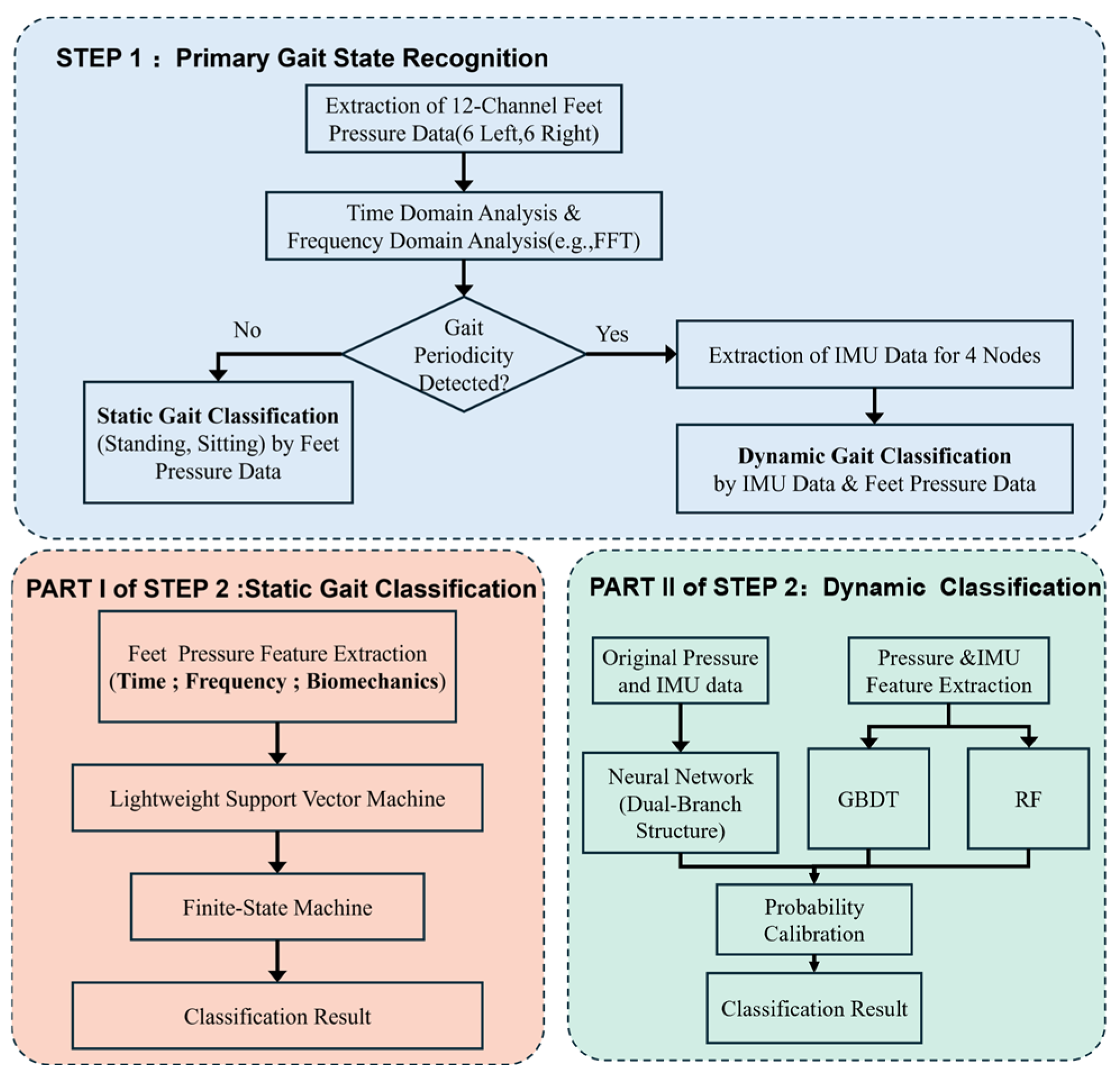 - If periodicity is detected, the system determines that the subject is performing dynamic motion like walking and running, activating the Dynamic Gait Classification Branch. At this point, the system synchronously retrieves data from the 4-node Inertial Measurement Unit (IMU) for fused analysis with the pressure data.