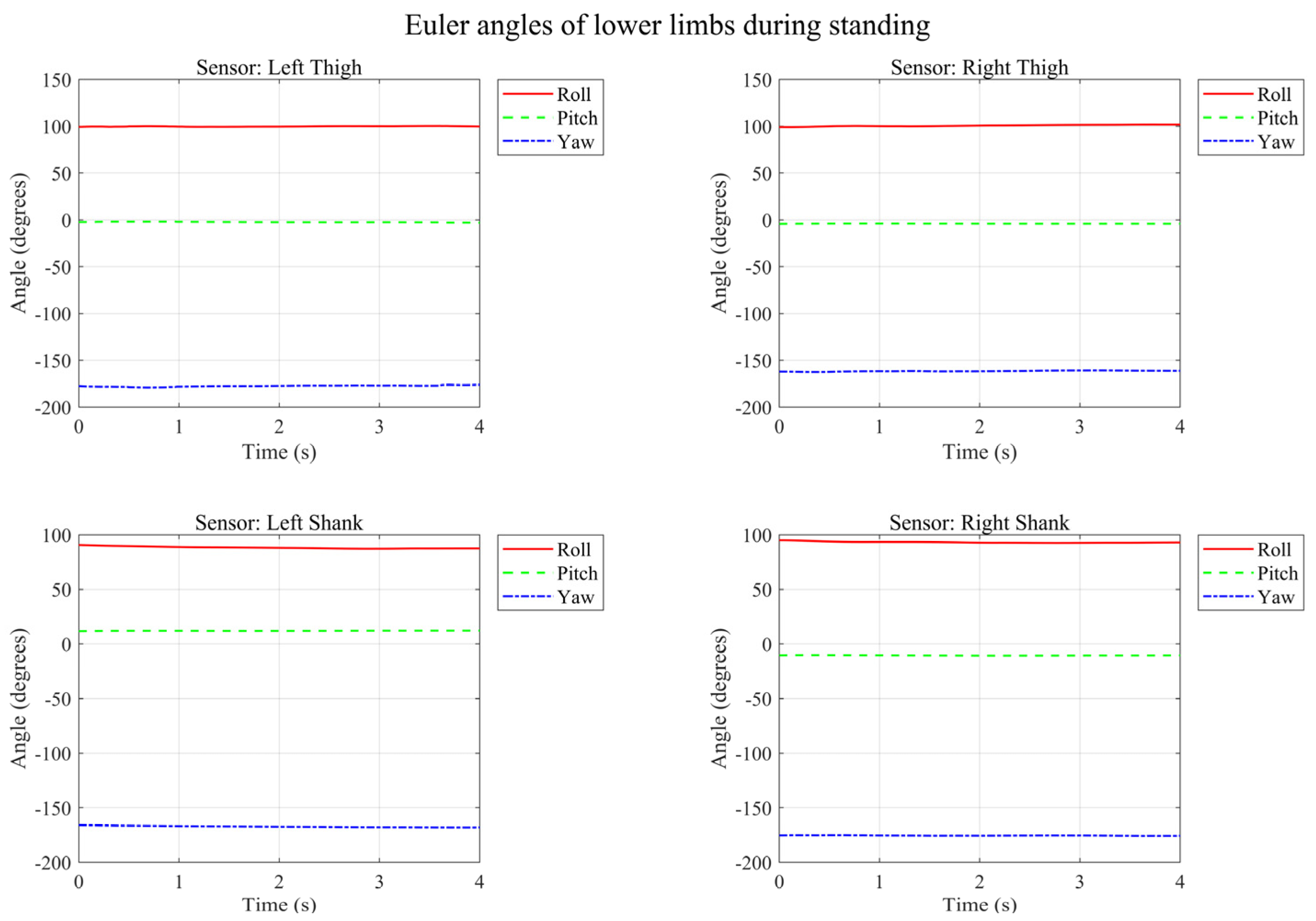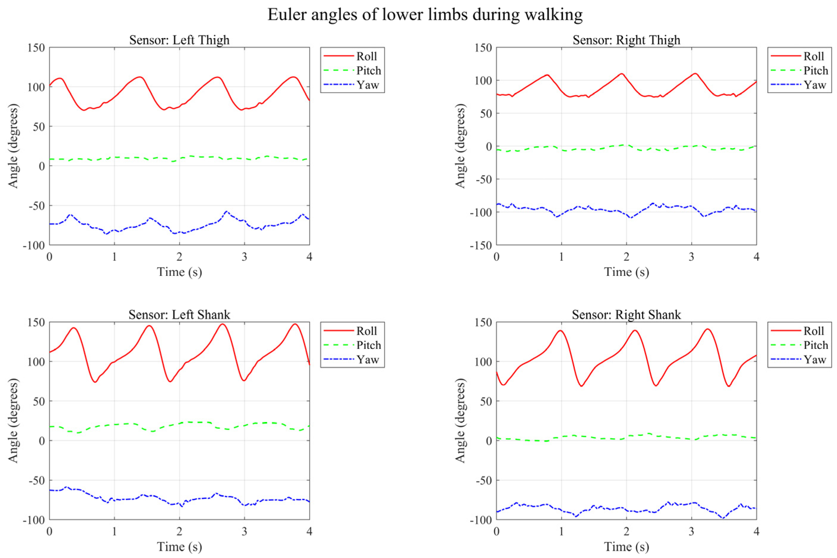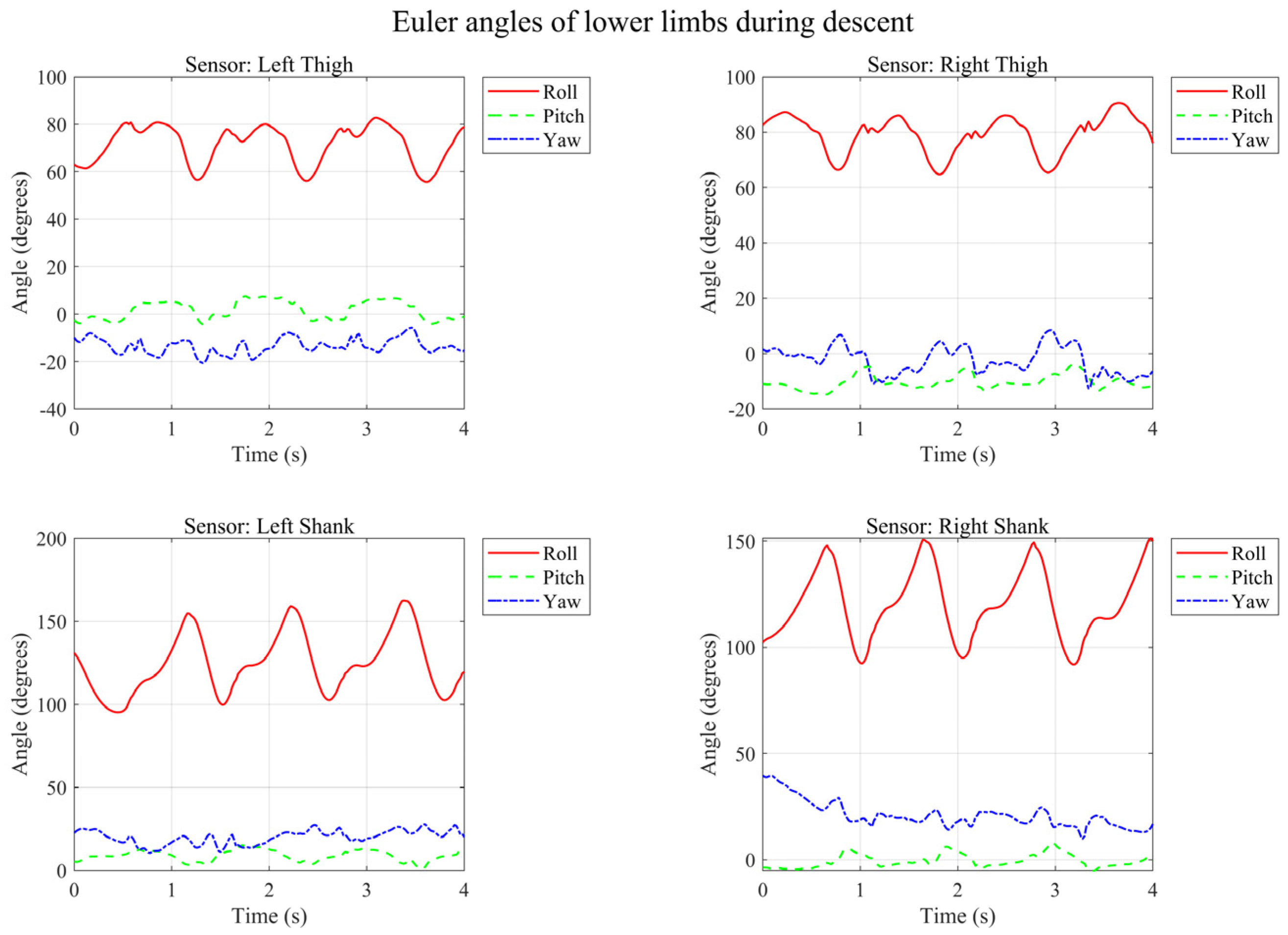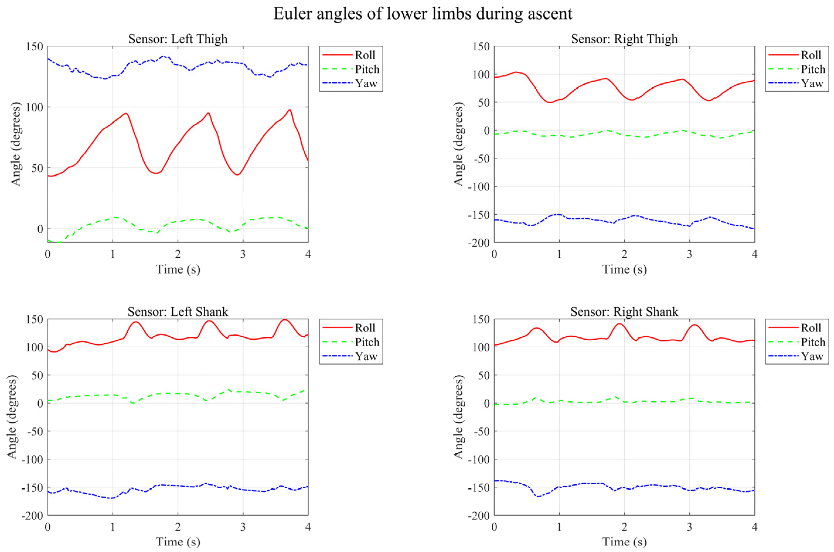 - Stair Ascent/Descent: Some confusion occurred at the turning points or the start/end phases of the stairs, as the limb swing amplitudes (Roll/Pitch angles) were relatively similar to level walking during these specific phases.