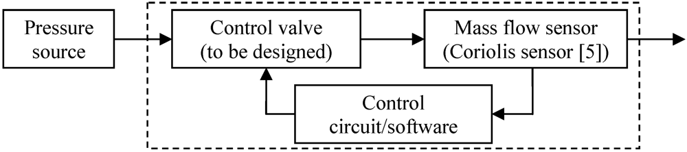 Precise fluid flow control is a key requirement in many reaction, production or analytical processing systems. Over the past decade, miniaturization of complex fluidic systems has led to many new and potential applications, including microreactor assemblies [1], microscale chemical analysis systems [2] and medical systems such as rapid DNA sequencers [3] and drug micro-dosers [4]. However, the need for a small-volume, high-precision mass flow controller for minute fluid flows has not yet been fulfilled. A typical mass flow controller can be modeled as shown in Figure 1. It consists of a mass flow sensor, a proportional control valve and control electronics connected in a closed control loop, set to adjust flow to a specific set point.