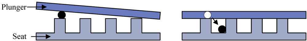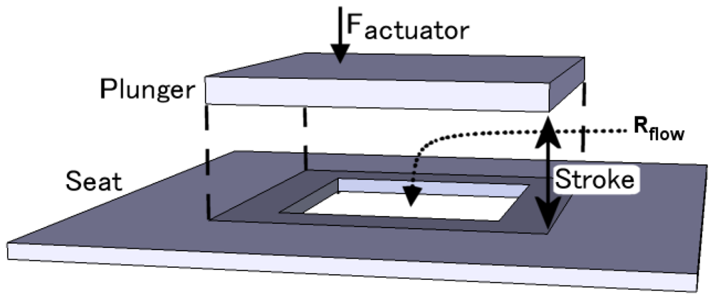 A basic design of a mechanical control valve is shown in Figure 2, consisting of an orifice in a fixed plate (the valve seat), which is covered by a vertically translating plunger. The maximum flow supported by the valve is defined by the structural dimensions—specifically, the diameter of the orifice and the separation between the two plates. The maximum separation that can be achieved is called the stroke. The leakage performance of a valve is determined by the closing surface area, the relative surface roughness and flatness of seat and plunger and the force by which the plunger is pressed against the seat.