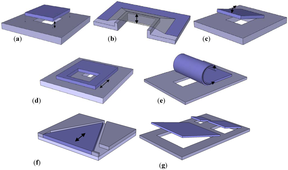 Schematic drawings of several microvalve design concepts. (a) Vertically translating plate; (b) Vertically translating membrane (cross-section); (c) Tilting plate; (d) Horizontally translating plate; (e)Bending plate; (f) Needle (planar); (g) Scaling valve array.