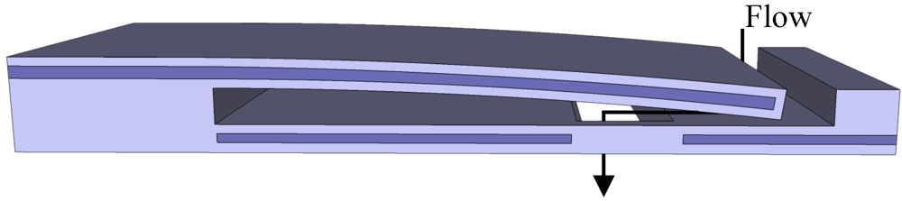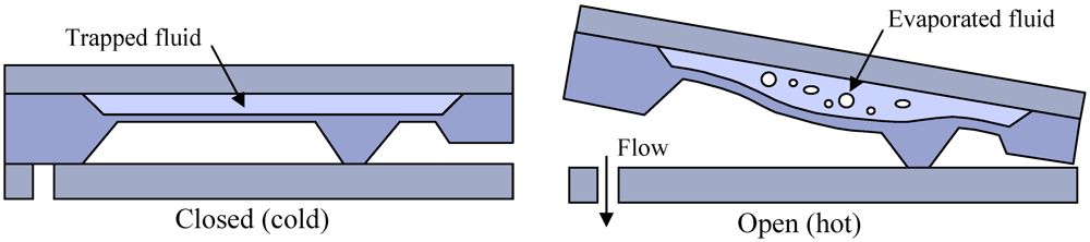 A more elaborate variation on the tilting plate concept utilizes specific materials, or combinations of materials, to fabricate a plunger that detaches itself from the valve seat. Material properties, such as thermal expansion, piezoelectric strain or phase-change shape memory, can be applied to obtain plates that bend or curl away from the valve orifice, as shown in Figure 3(e). The gradual “peeling” of the plate can significantly reduce the force required to overcome plate stiction. It can also allow for precise flow control, provided the actuation has sufficient resolution. A drawback is the large bending moment created by the fluid pressure on the necessarily compliant plate, which leads to low leakage performance at large differential pressures.