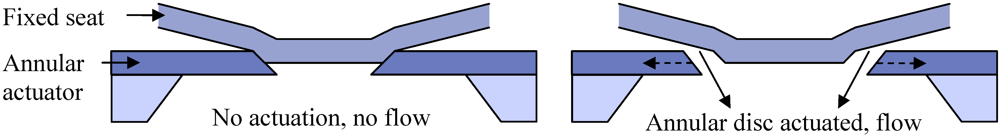 The needle valve concept can be applied at the microscale as well, although the reduced dimensions mean the total closure contact is significantly reduced. This, in combination with the limited pressures available from micro-actuators, increases the demands on the contact between plunger and seat significantly. To obtain low-leakage closure, the surfaces must be made exceptionally smooth and flat with respect to each other so that they can fit closely together. It should be noted that the planar design illustrated in Figure 3(f) is not well suited to low leakage, because of the inherent tradeoff between friction and closure due to the sliding motion of the needle.