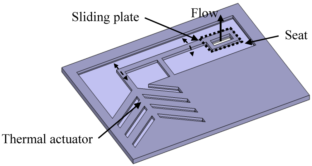 The sliding motion can be executed linearly, in rotation or using a pivoting structure. The latter design is used in a valve reported by Williams et al. [28] and shown in Figure 8. Thermal expansion of silicon rods pushes a perforated plate across the valve seat, changing the overlap of the orifices.