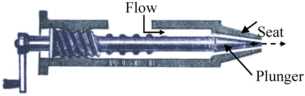 Macro-scale needle valve, using a tapered plunger (needle) to increase closure contact and controllability [29].