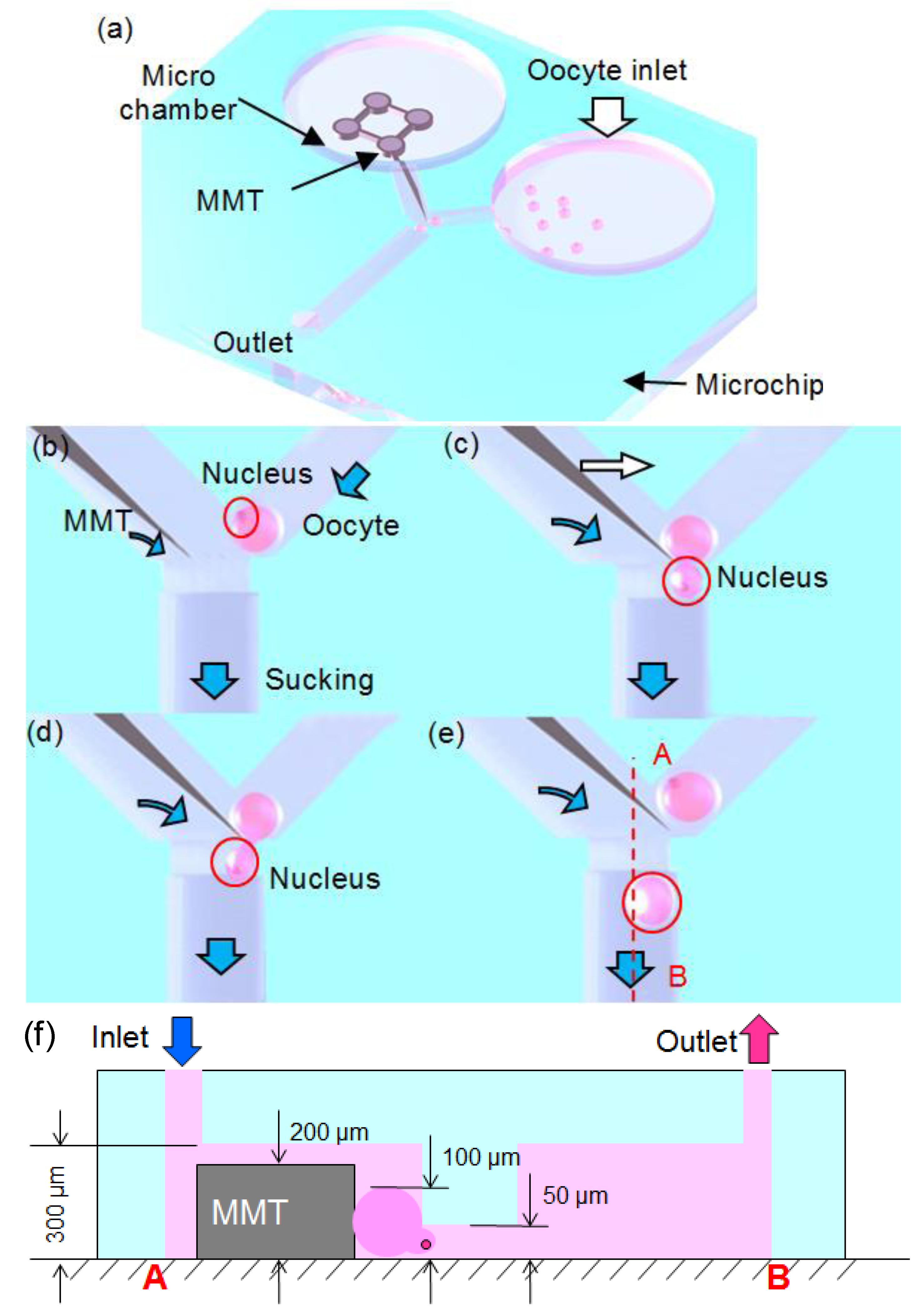 (a) Overview of the enucleation microchip. (b–e) Concept of the oocyte enucleation process by the use of magnetically driven microtools (MMTs) in a microfluidic chip. Blue arrows show the flow direction. (f) Height differences in the microchannel design. The white arrow shows the movement of the MMT.