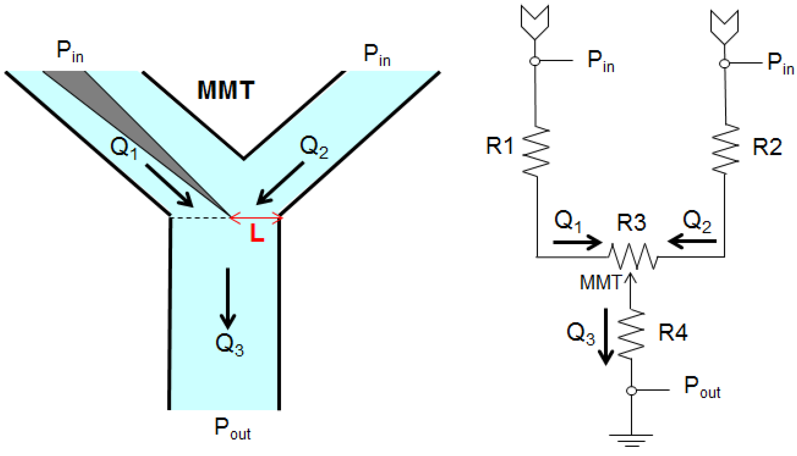 In representing the flow of a fluid as the flow of electricity, some insight into the process is gained; the fluid in a hydraulic circuit behaves similar to electrons in an electrical circuit. An electric circuit analogy is used in Figure 2 to specify the parameters of the microchannel [19]. The total volumetric flow rate Q (m3/s) in a rectangular microchannel is described by Hagen–Poiseuille’s law [20] as