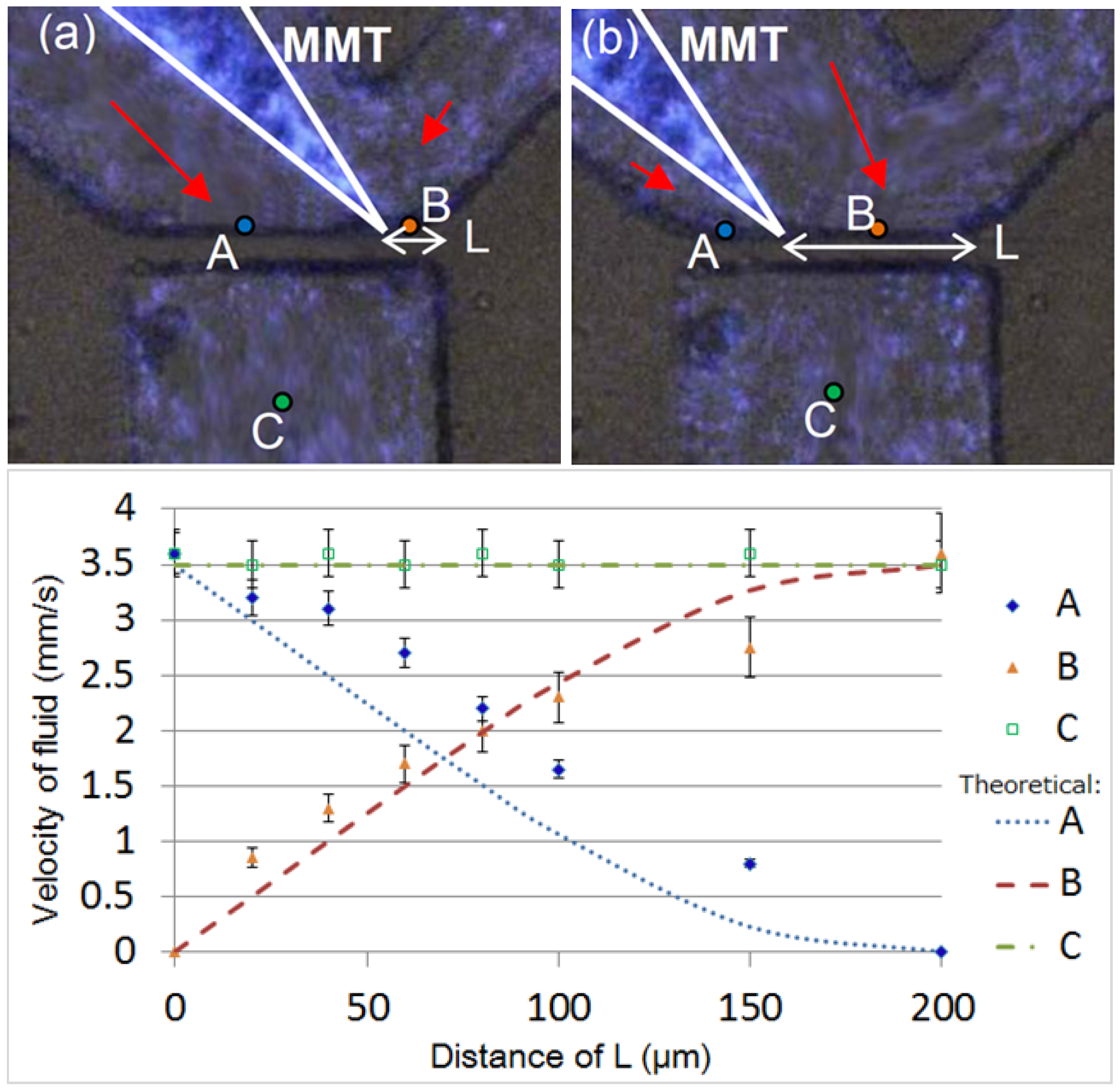 We conducted the experiments by loading fluorescent microbeads (Ф: 2 µm) into the microfluidic chip to demonstrate the effectiveness of the MMT movements on the velocity of the fluid. Figure 3 shows the fluid velocity with respect to the position changes of the MMT. In Figure 3a, when the MMT is near the right-side corner of the withdrawal microchannel, the velocity of fluid on the left side is higher than on the right side of the MMT. In Figure 3b, when the MMT is near the left side, the velocity of fluid in the microchannel on the right side is higher than on the left side. Three representative points were selected to assess the velocity distribution in the microchannel. The pressure distribution on the oocyte was derived from the velocity distribution. Points A and B show the distribution of velocity on both sides of the MMT at the suction port, while point C was used to the observe velocity changes in the suction channel. The width of the microchannel is 200 µm and we measured the distance L at points along the range of 0–200 μm. Figure 3c shows the experimental results as well as the theoretical results for the fluid velocity changes with respect to the MMT position at each point. When the position of the MMT was at the right edge of the channel (L = 0 μm), the flow from the right side of the channel ceased, whereas when the position of the MMT was at the left edge of the channel (L = 200 μm), the flow from the left side ceased. The experimental values reasonably corresponded to the theoretical values, proving that the flow distribution in the channel was well-controlled by the MMT position, similar to an adjustable valve. As a result, the surface traction forces (FD) affecting the oocyte can be adjusted to conduct the oocyte enucleation process by allowing the oocyte to split via the hydraulic force and to be flushed away by the flow.