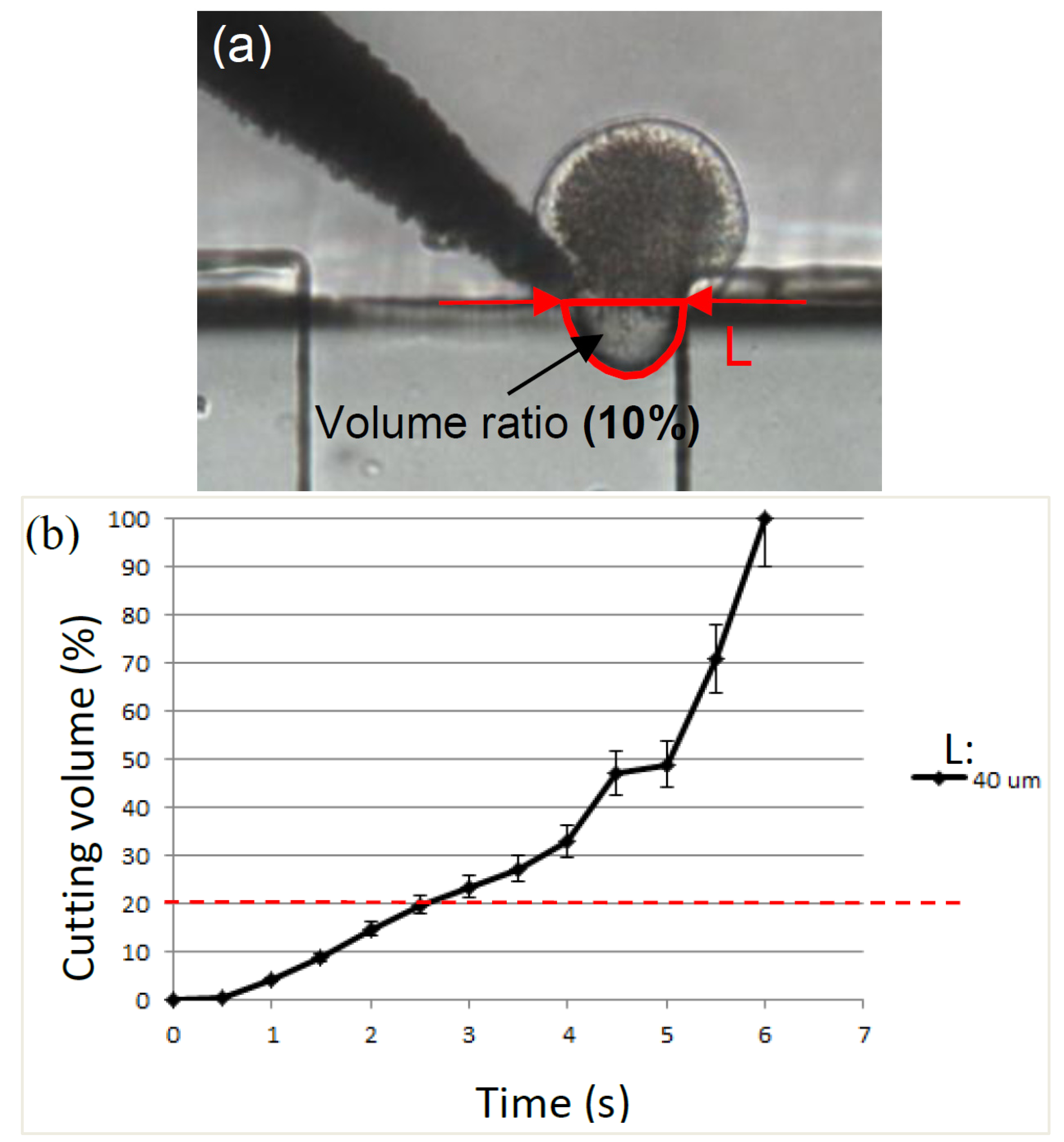 In the experiment, the outlet velocity (point C in Figure 3) was fixed to avoid interference from the pump. The outlet of the polydimethylsiloxane (PDMS) chip was connected to a syringe pump using a Teflon tube. The relationship between the oocyte volume sucked into the outlet microchannel and the suction time was obtained. The distance between the MMT tip and the right edge of the withdrawal microchannel, L in Figure 4, can vary, which would result in a change in the velocity of the sucked volume. In our experiment, the MMT position was fixed at a distance of 40 μm from the right edge of the channel, and the oocyte with a nucleus had enough space to be suctioned into the withdrawal microchannel. The suctioned volume of the oocyte was measured by the oocyte area in the channel and the height of the channel (Figure 4a). Figure 4b shows the experimental results of the volume ratio of the sucked volume into the channel to the original oocyte volume with respect to time. The graph shows that the error bars at each data point are small. Especially, the volume suctioned in the channel in less than 3 s was consistent and the variation was less than 5%. This indicates that the volume control over time using an MMT and fluid forces is highly accurate, enabling a precise enucleation process.