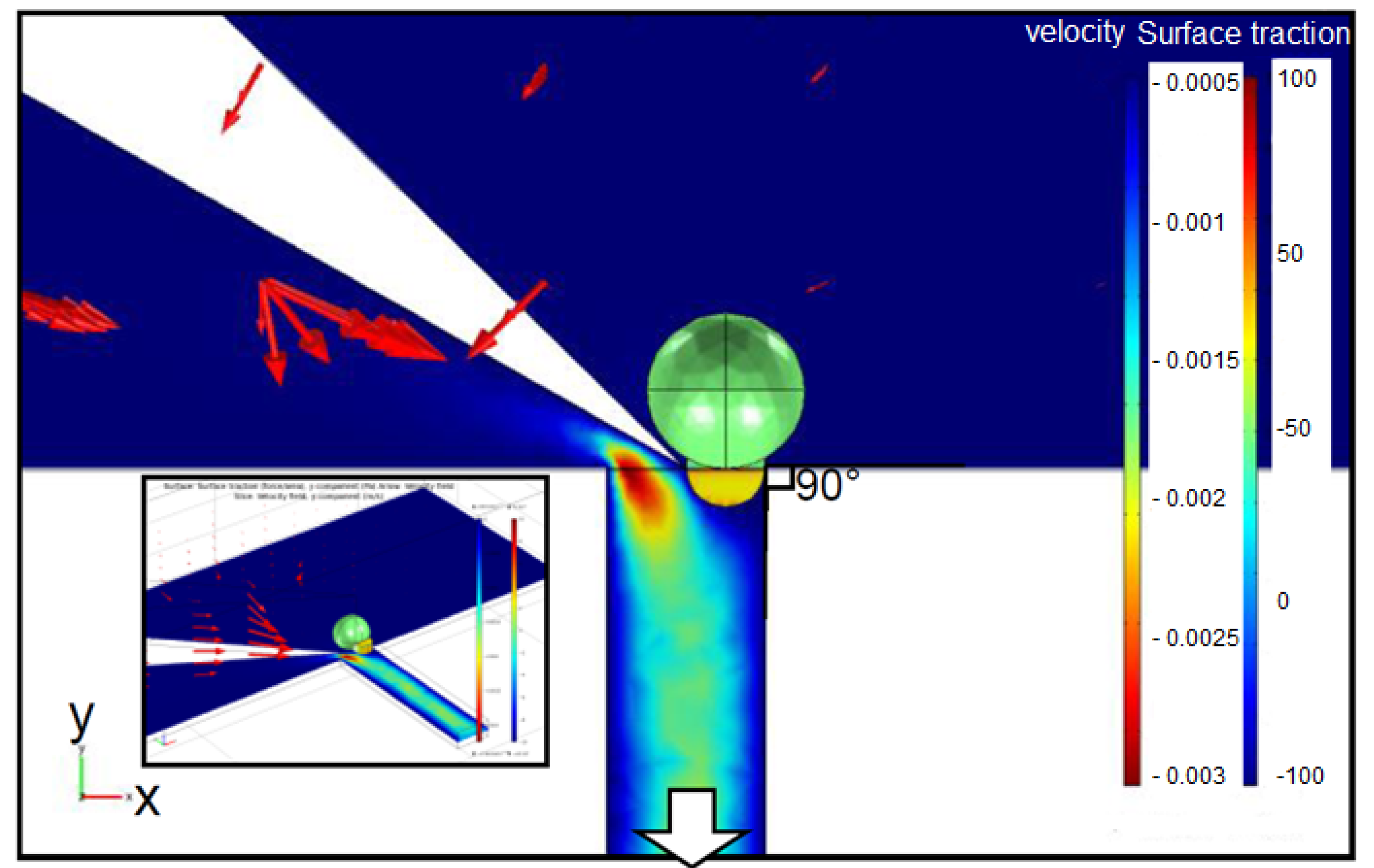 FEM results of the velocity distribution and the surface traction of oocytes in the Y-direction. Object surface: y component of surface traction (force/area) (Pa). Arrow: Velocity field, Slice: y component of velocity field (m/s).