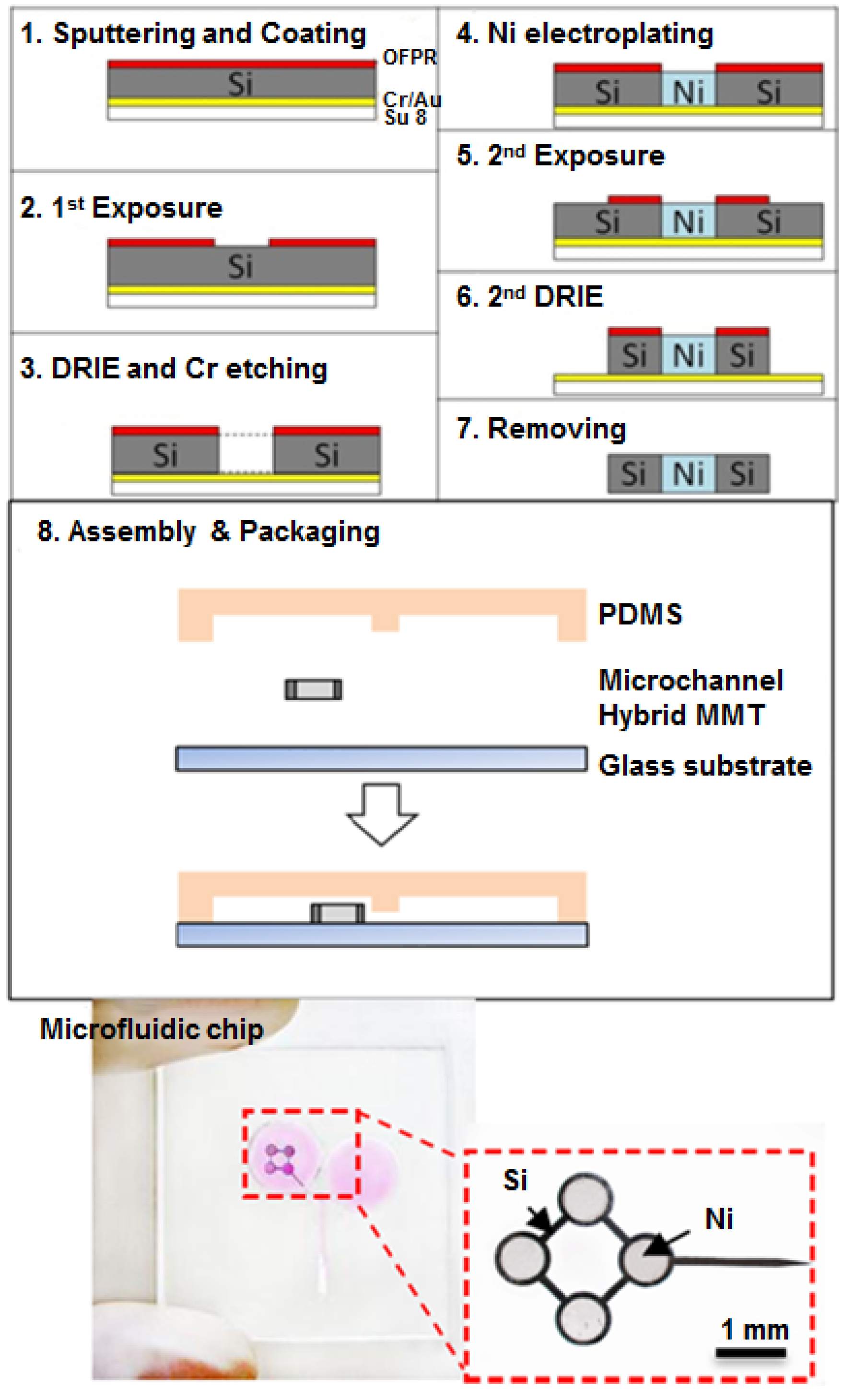 Ni is ferromagnetic and can be magnetically attracted by a permanent magnet, but it is easy to bend during handling because of its ductility and thinness. As a result, smooth Ni is difficult to maintain, which is essential for flow control in the channel. Therefore, we employed a hybrid MMT composed of Ni and Si, which is both rigid and bio-compatible. The Ni-Si MMT fabrication process is shown in Figure 6. At first, Au and then Cr were sputtered onto the Si wafer (thickness = 200 μm). Then, the wafer was coated with a thick negative photoresist (SU-8, Tokyo Ohka Kogyo Co., Kanagawa, Japan) and then exposed on the Si substrate so it could be utilized as a support layer. The other side of the Si wafer was coated with the photoresist OFPR (Tokyo Ohka Kogyo Co., Kanagawa, Japan). After the exposure on the OFPR side, the OFPR pattern was developed. Next, deep reactive-ion etching (DRIE) was conducted on the OFPR side, and the Si was etched to a depth of 200 μm, until the Cr/Au layer stopped the etching process. After the wet etching of the Cr, the Au surface was exposed. Then, Ni was grown on the Au surface by the electroplating method to a thickness of 200 μm. After the Ni accumulated in the holes on the Si substrate, we again conducted the OFPR coating, exposure, and DRIE processes to form the MMT shape. At last, by removing the photoresist and the Au layer, a hybrid MMT was fabricated.
