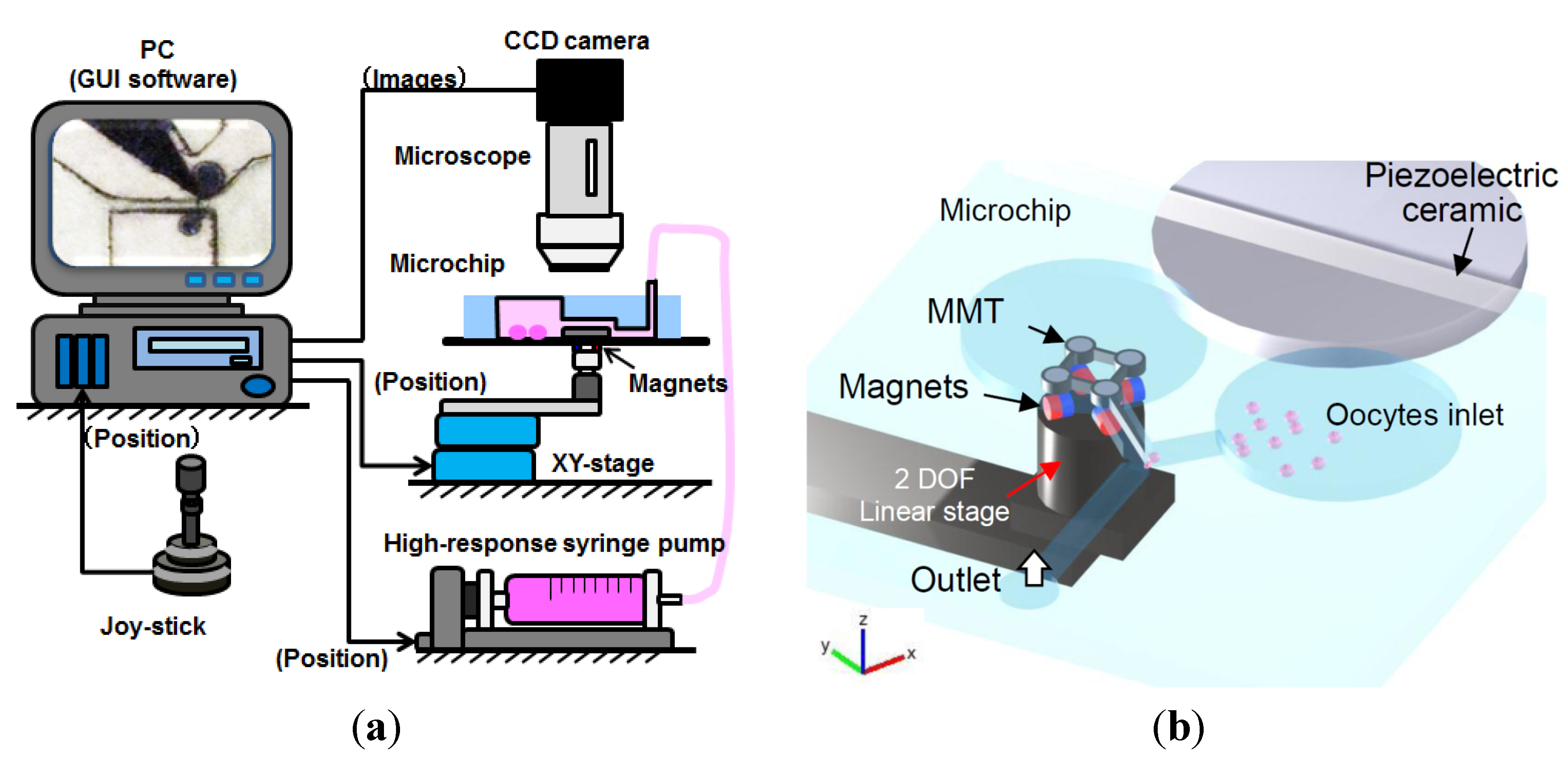 Components of experimental system: (a) experimental setup for the enucleation of oocytes including the linear stage for magnet actuation, a microfluidic chip, and a piezoceramic for generating vibrations on the microfluidic chip and (b) system architecture.