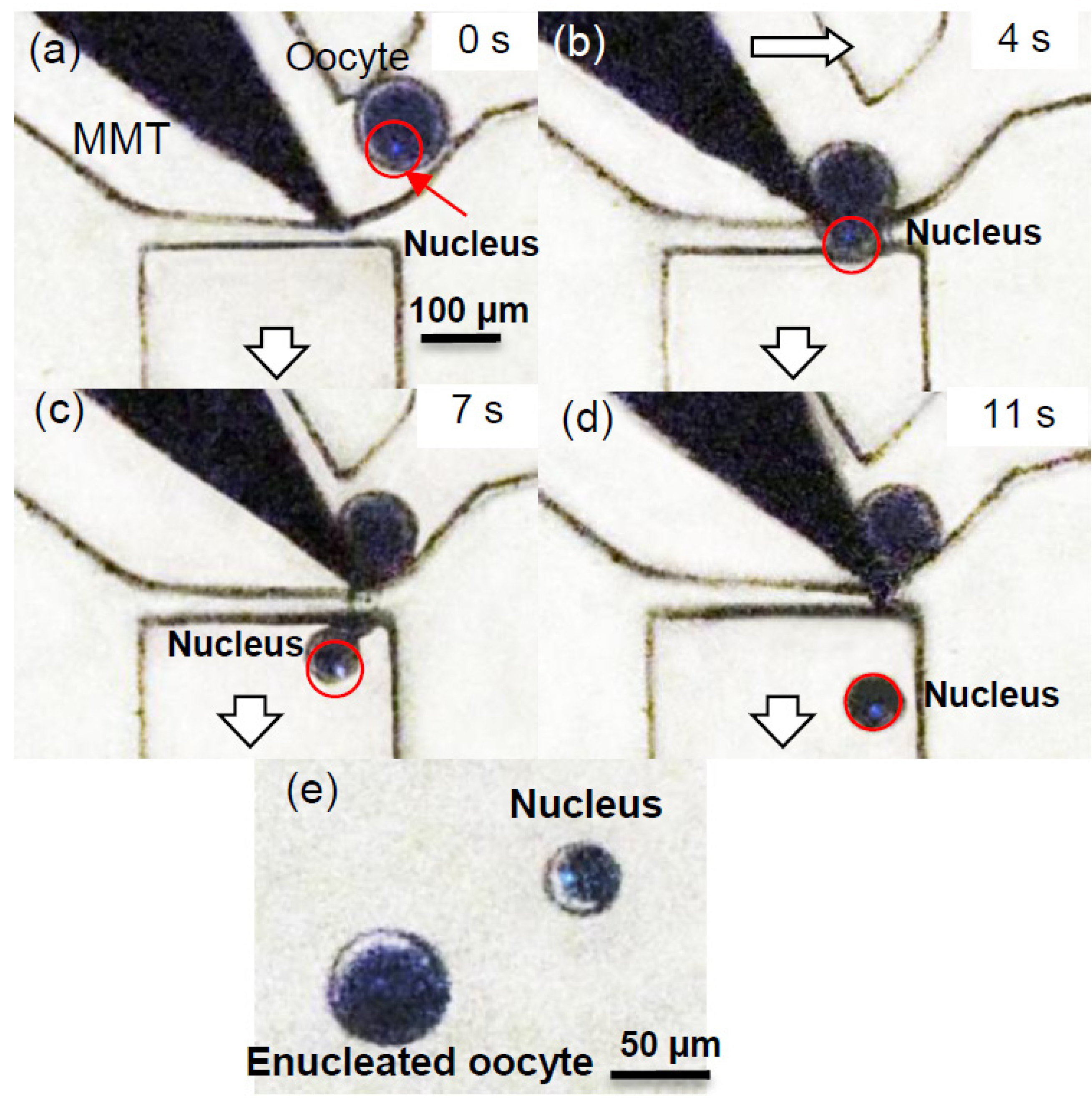 Enucleation by a dual arm MMT was conducted previously [18]; however, it was difficult to remove the nucleus because the oocyte is a viscoelastic material. The cutting process is a complicated model because the oocyte is soft and sticky. Once the tip of the MMT blade touched the surface of the oocyte, a resistance force generated by the oocyte decreased the position accuracy. In addition, achieving the enucleation process was difficult because the oocyte flow was not well-controlled.