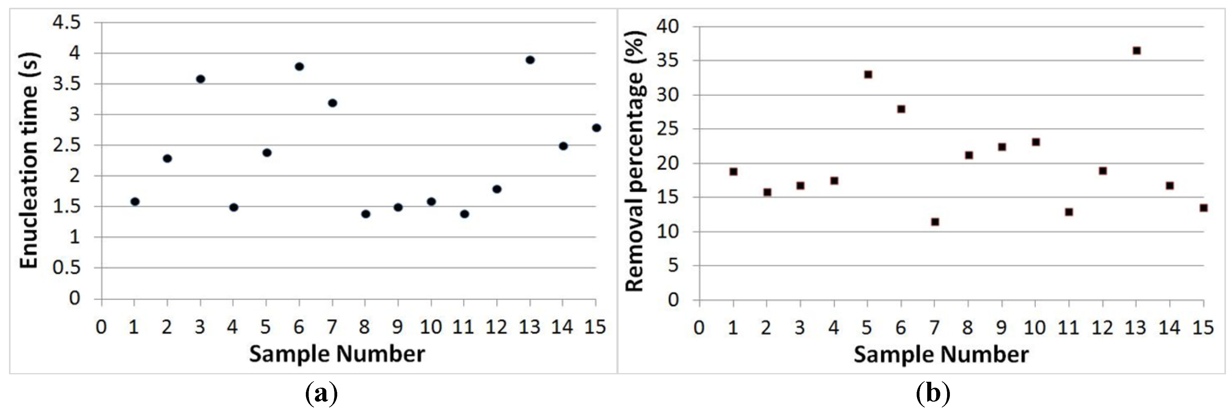 (a) Enucleation processing time for 15 samples; the average enucleation time is 2.5 s for one oocyte. (b) Removal proportion of the nucleus from the original oocyte for 15 samples; the average removal proportion is 20%.