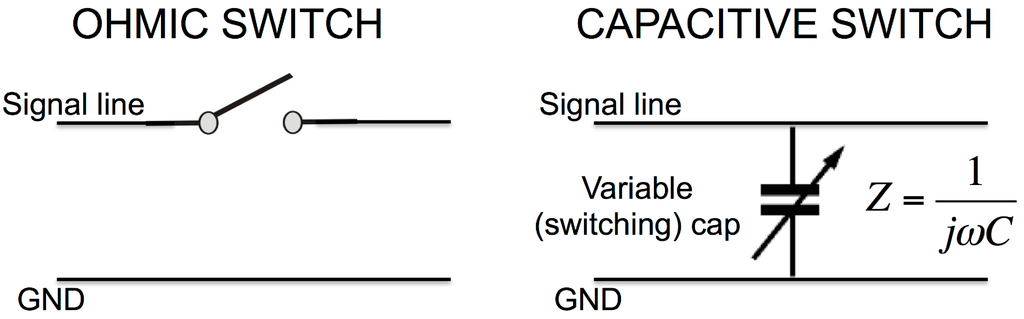Microelectromechanical switches are substantially different from P-type/Intrinsic/N-type (PIN) semiconductor diode or Field Effect Transistor (FET) switches, although the purpose of both types of devices is to vary the impedance of an electrical path in a controlled fashion. While solid state devices employ electric fields to vary the conductivity of a channel, effectively closing or opening a conduction line, MEMS switches utilize mechanically moving parts to physically vary the distance between two conductive elements of a signal line in order to make or break an ohmic contact (in the case of ohmic switches), or to increase or decrease the enclosed capacitance (in the case of capacitive switches). Various examples of MEMS switches in ohmic and capacitive configuration are reported in Section 2.3 and Figure 1 illustrates the two different switching principles.