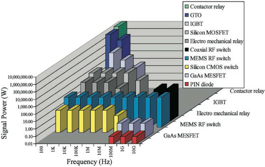 Switch technology applications as a function of signal power levels and frequencies. Reprinted with permission from []. Copyright 2000 IOP Publishing.