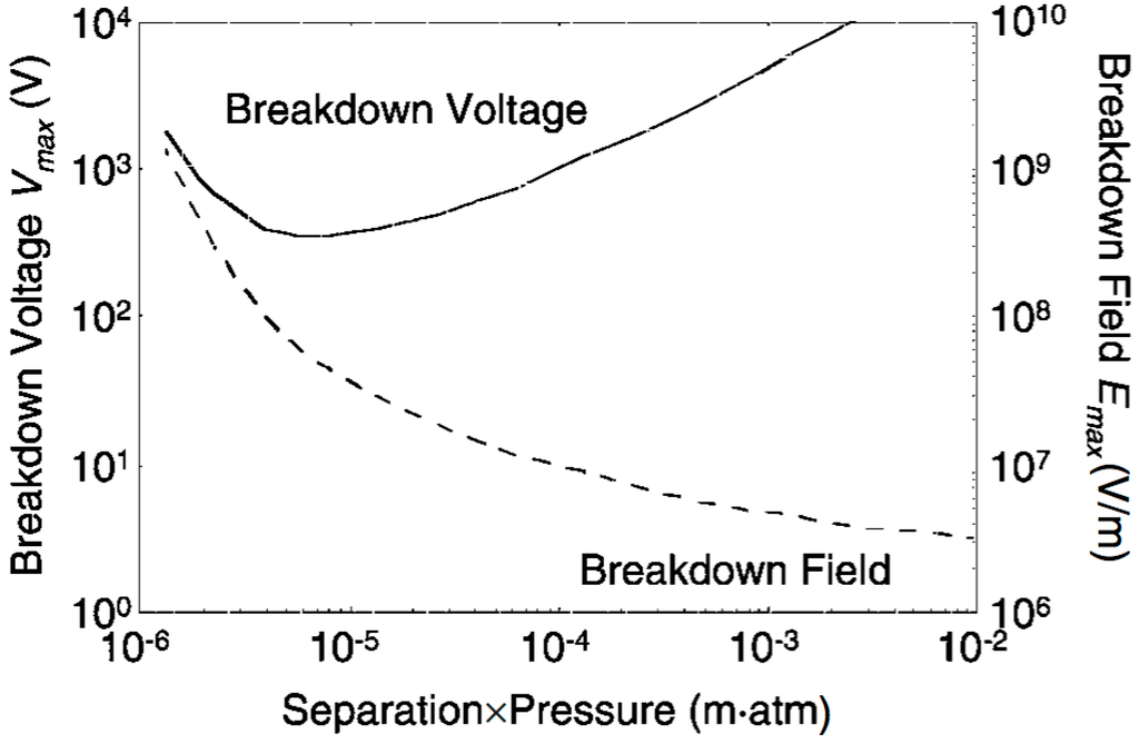 Paschen curve: electrostatic breakdown voltage as a function of separation and pressure []. Reprinted with permission from []. Copyright 2001 IOP Publishing.