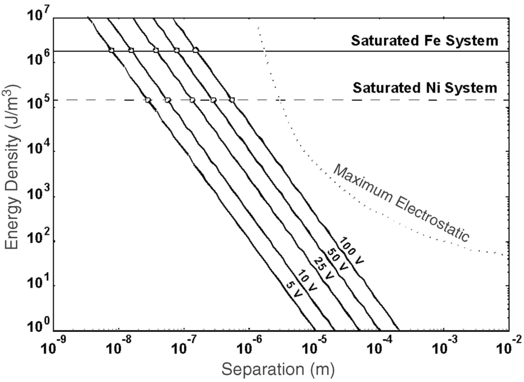 . The value of the magnetostatic energy density Umagnetostatic is limited by the saturation flux density, Bsat, of a magnetic material or by the maximum magnetic flux density generated by an electromagnet. For a system with a mid-range flux density in the order of 0.1 T, the associated magnetostatic energy density is around 4000 J·m−3, using the vacuum permeability value µ0 = 4π × 10−7 V·s·A−1·m−1. It is clear from the ratio of these two values (Umagnetostatic / Uelectrostatic ≈ 102) that magnetostatic architectures have a higher energy capability per unit volume. This result is obtained on quantities that represent energy densities, and are thus to a certain extent independent of the dimensions of the fabricated structures. Figure 4 shows a comparison of the energy densities for electrostatic actuators at different voltages and actuators based on magnetic materials such as iron or nickel as a function of the gap distance []. The plot shows that there are indeed crossover points where electrostatic systems have greater energy capacity, but this only occurs for very small distances or very high voltages. Unfortunately, both these conditions do not fall into viable ranges for application in integrated MEMS devices.