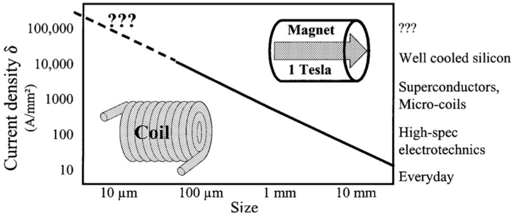 Referring to the simple calculations proposed by Judy [], it is possible to make a quick comparison between the energy density capabilities of electrostatic and magnetostatic architectures. The electrostatic energy density in a region of the space where an electric field