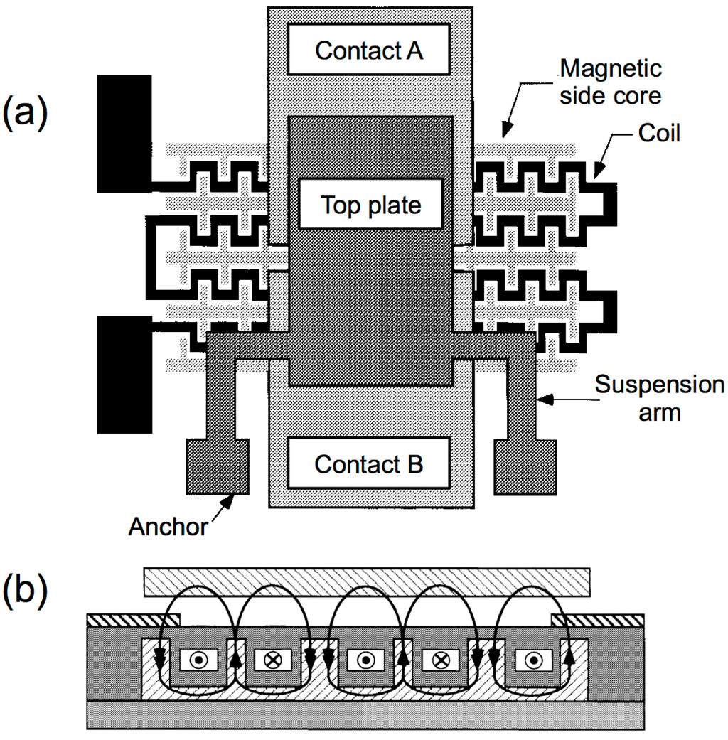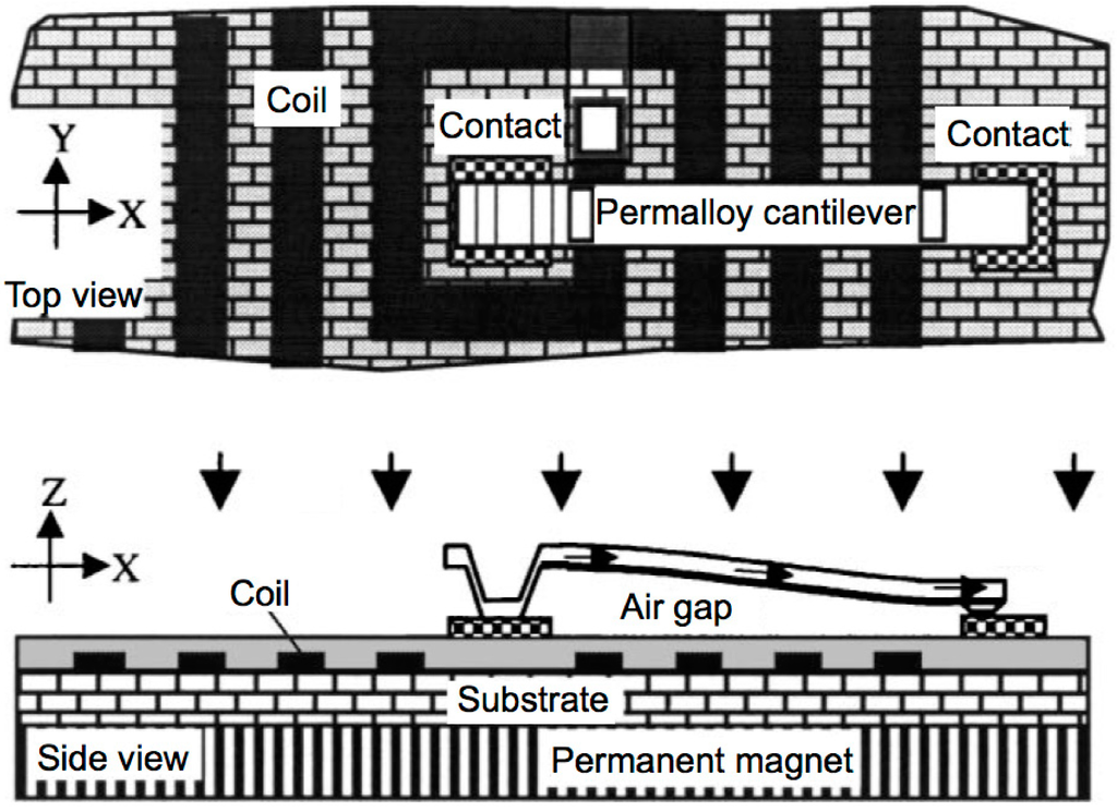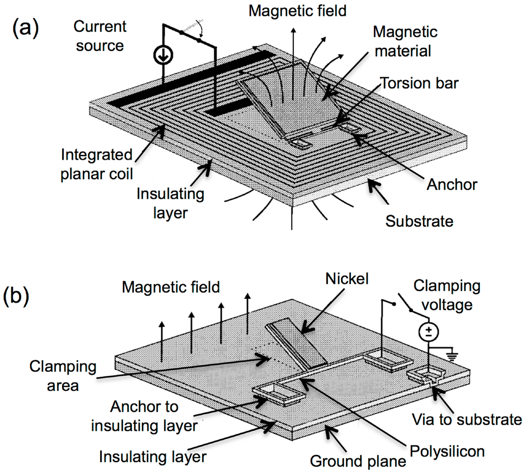 Magnetic MEMS are based on the interaction between sources of electromagnetic or magnetic forces such as coils or permanent magnets and microstructures fabricated with magnetic materials. The strong interest in the application of such old and well-established physics to microscale components lies in the advantages offered by magnetic forces over conventional electrostatic components at smaller scales. As detailed in [], MEMS employing magnetic actuation potentially offer better performance with respect to other schemes, namely the generation of much higher magnitude forces with lower spatial decay.