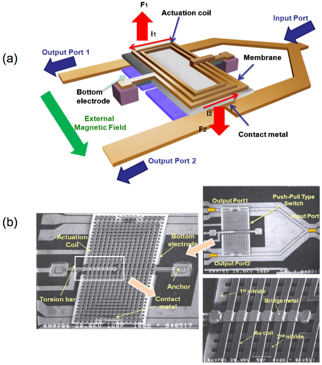 - Cho, I.; Yoon, E. Design and fabrication of a single membrane push-pull SPDT RF MEMS switch operated by electromagnetic actuation and electrostatic hold. J. Micromech. Microeng. 2010, 20, 1–7. [Google Scholar]