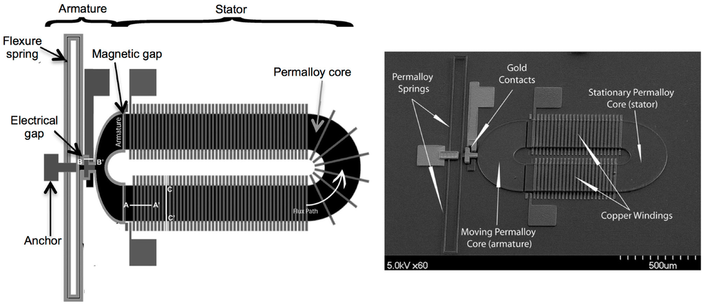 - Taylor, W.P.; Allen, M.G. Integrated magnetic microrelays: Normally open, normally closed, and multi-pole devices. In Proceedings of the International Conference on Solid State Sensors and Actuators, TRANSDUCERS’97, Chicago, IL, USA, 16–19 June 1997; pp. 1149–1152.