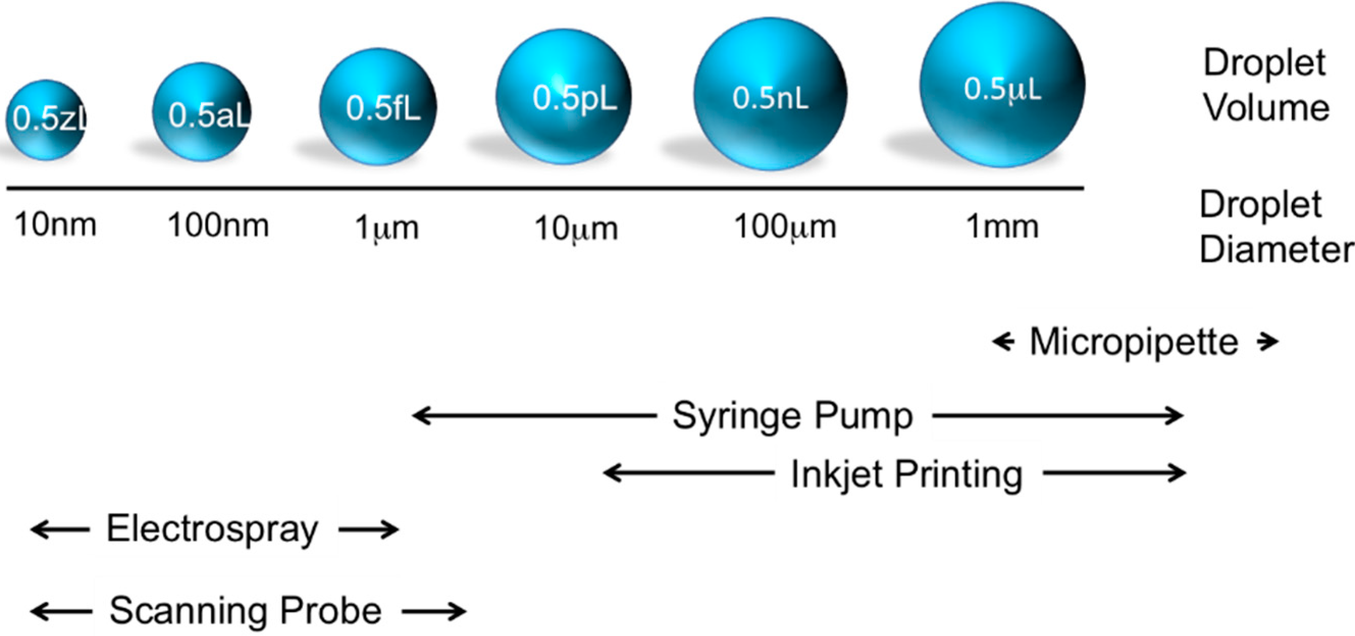 Various dispensing techniques and their respective droplet diameter and volume range that can be obtained.