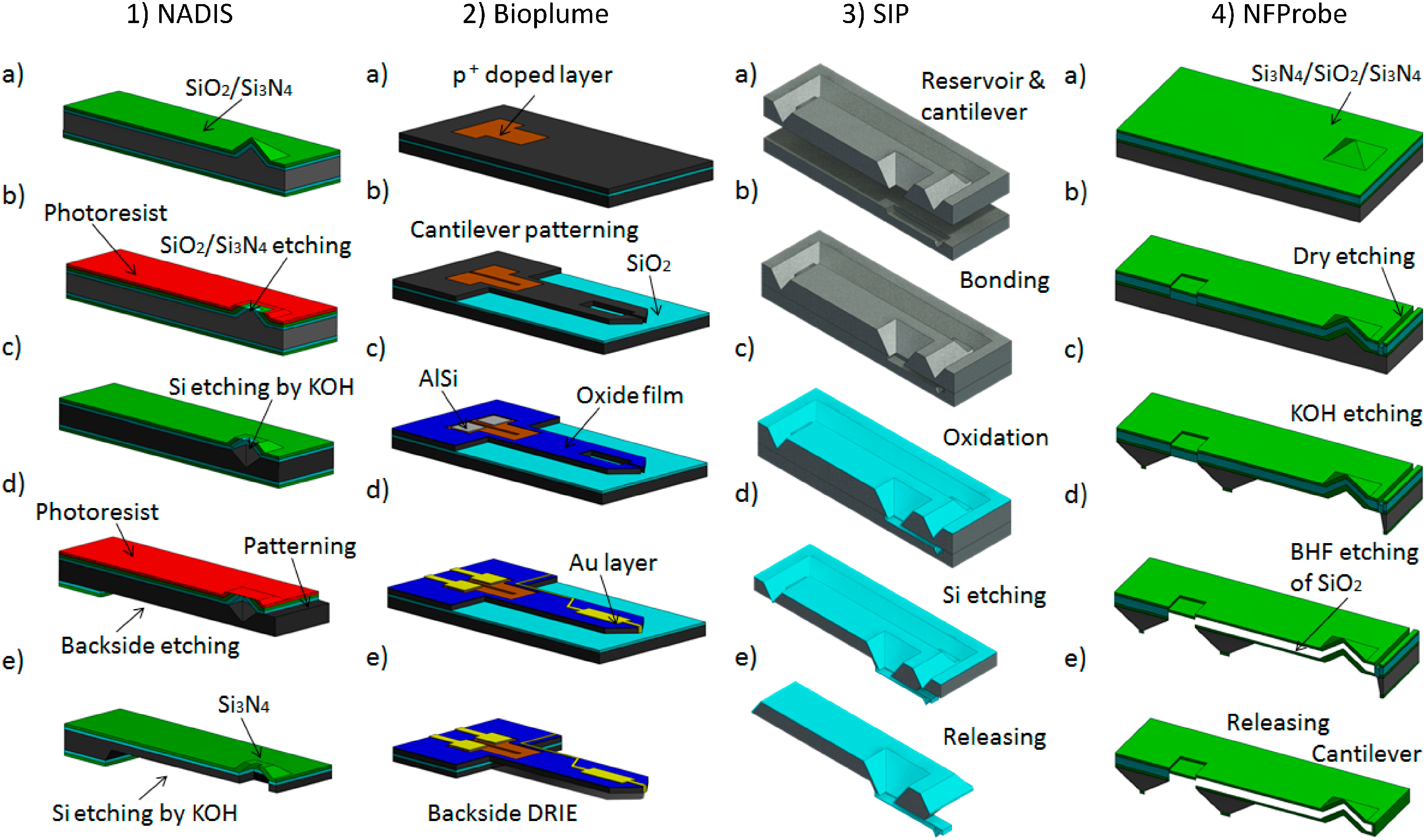 The microfabrication process steps for (1) Nanoscale Dispensor (NADIS), (2) Bioplume, (3) Scanning Ion Pipette (SIP), and (4) Nano Fountain Probe (NFProbe) are shown in separate columns. The details of the steps from (a–e) for each device are described in the text.