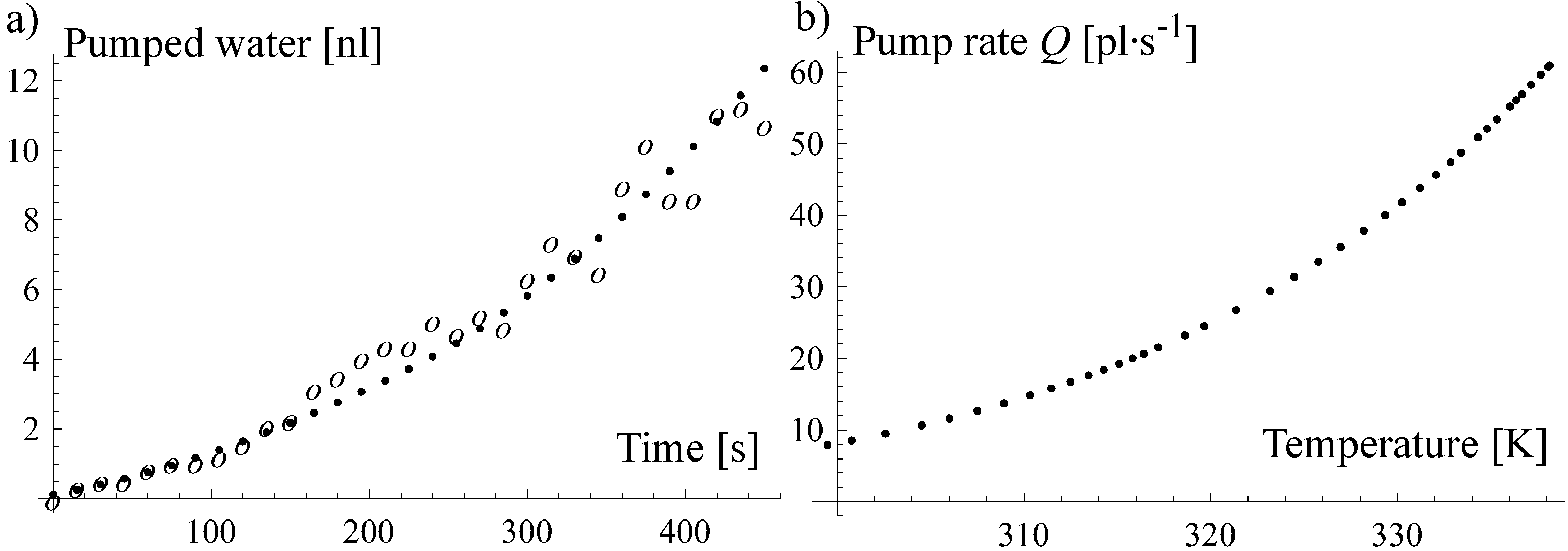 The pumped water volume according to the accumulation of microspheres is shown in Figure 5a represented by open circles. The non-linear increase of flow rate was due to the deliberate increase of temperature during the experiment. Merging this graph together with the measured temperature finally yields the temperature dependency of the pump rate as shown in Figure 5b. With the present setup, a pump rate ranging from 7 pL/s at 23 °C up to 53 pL/s at 65 °C was achieved [99].