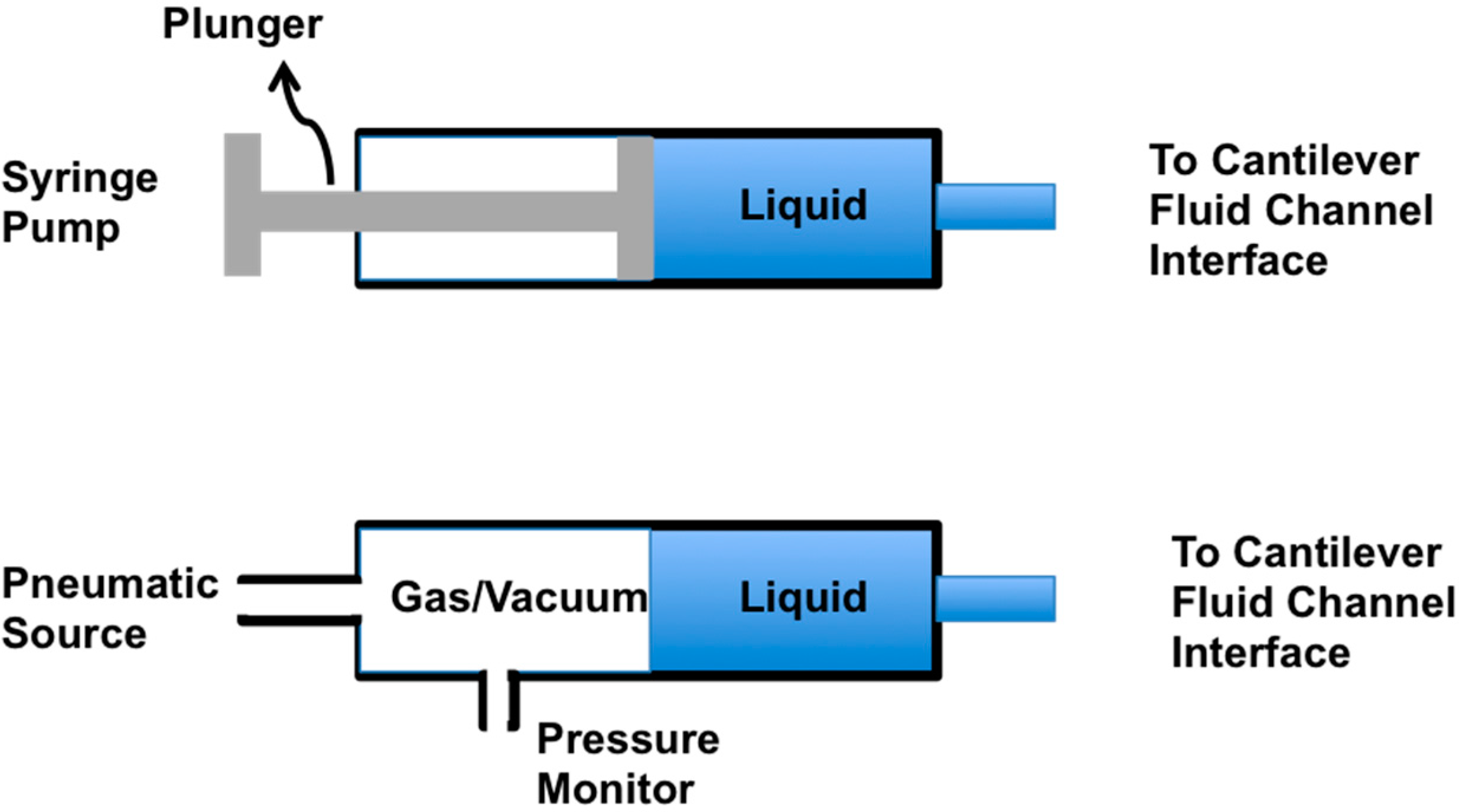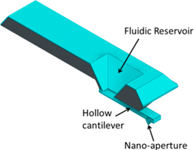 All other probes discussed in this review have fluid storage reservoir connected directly to the aperture at the tip from where the dispensing happens. The hydrophilic nature of the channels allows self-filling of the cantilevers with ink due to capillarity once a tiny droplet is loaded in the reservoir. However, if the cantilevers are left in the air after fabrication, even surfaces like silicon-dioxide or silicon-nitride become slightly hydrophobic. This happens due to the physisorption of hydrocarbons present in the air inside the hollow cantilever surface. This could be, momentarily solved by cleaning in oxygen plasma or piranha-solution, which makes these channels hydrophilic again. The channels would become hydrophobic again within few minutes when left in the air. If that happens, the liquid has to be driven into the channel using pumps. Furthermore, pumping of liquid is also needed if the hollow cantilevers are used for aspirating liquids or when operated in a liquid environment.