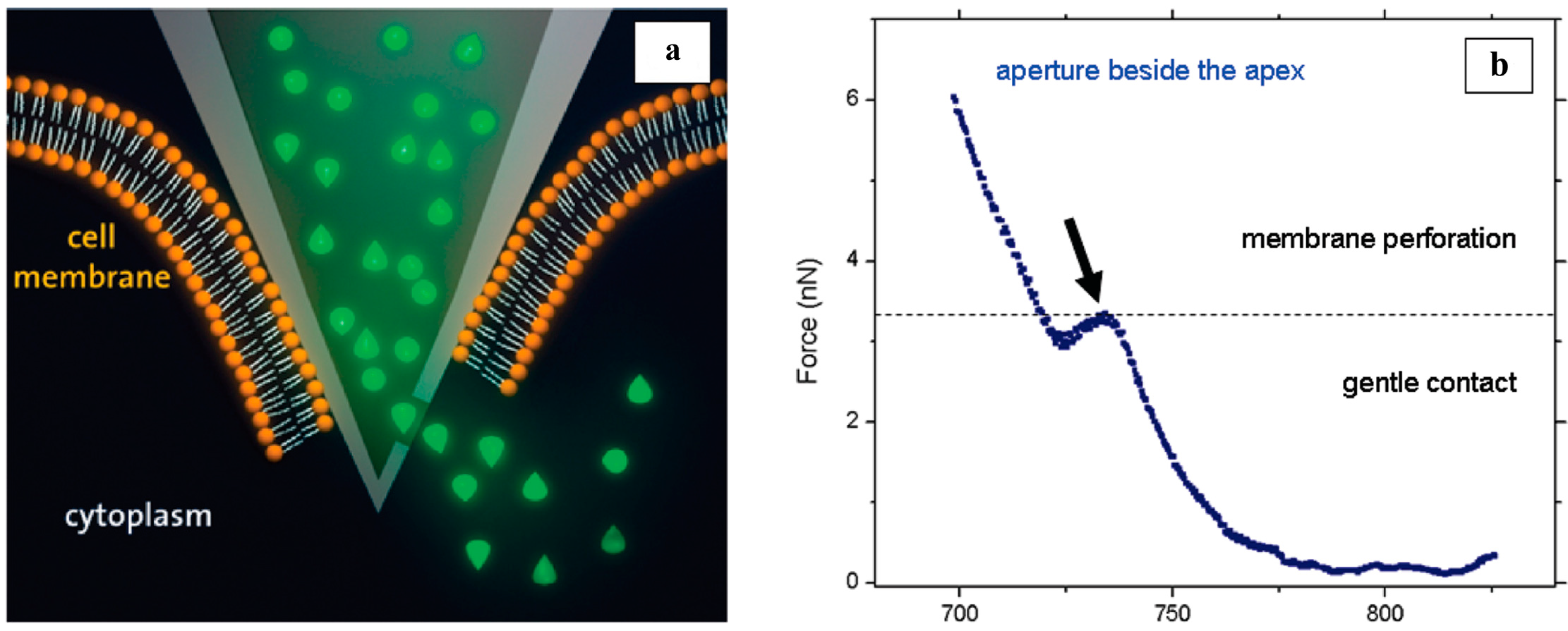 - Garza, H.; Stoute, R.; Ghatkesar, M.; Staufer, U. Self-sensing nanopipette for liquid dispensing and AFM imaging. In Proceedings of the 2013 Transducers & Eurosensors XXVII: The 17th International Conference on Solid-State Sensors, Actuators and Microsystems, Madrid, Spain, 16–20 June 2013; pp. 2648–2651.