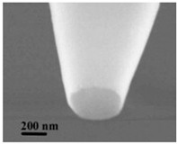 Without using any microfabrication techniques, glass can be pulled to make fine glass capillaries that can be used to dispense/aspirate liquids (Table 2, item a). Glass capillary with an outer diameter of 10 nm and a nozzle of 3 nm was shaped into a L-type cantilever, with 12 microns of short-length and 300 microns of long-length. With gold coating on the capillary, the cantilevered NFPen was used as a regular AFM probe. They have resonance frequencies of several hundred kilo-hertz and force constants of tens of N/m to tenths of N/m. Fountain pen nanochemistry was first demonstrated by etching a 16 μm long, 1.5 μm wide, and 200 nm deep trench in a chrome layer within 40 s at room temperature [26]. Electrophoretic protein printing [70], printing of protein array [71,72], deposition of single walled carbon nanotube [73], polymer lenses [74], molecularly imprinted microstructures [75,76] were also demonstrated using this technique. One of the challenges of this technique is the reproducibility in making the pens and their arrays for high throughput applications.
