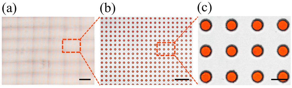 Microscopic images of the ultrahigh-throughput FDA using 50 μm wells. (a) Large-scale scan of 36 images containing more than 14,000 wells and (b,c) zoomed-in images of trapped droplets.