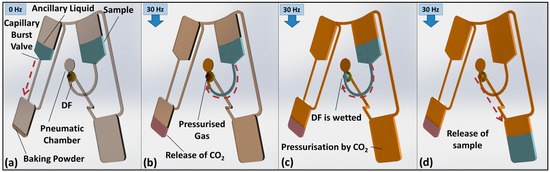 In this paper, we present a new mechanism for serial actuation of valves, which is largely independent of the spin rate. The CO2 gas issued by household baking powder [37,38] stored on-disc is released by an ancillary liquid to pressurise a sealed microfluidic compartment. Two alternative valve types are demonstrated. In a first approach, which we refer to as “volume governed”, the order of serial actuation of on-disc DF-valves is established through tailoring the volume of their respective pneumatic chambers (Figure 1).