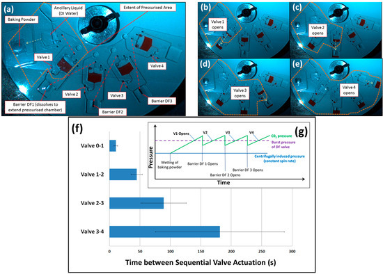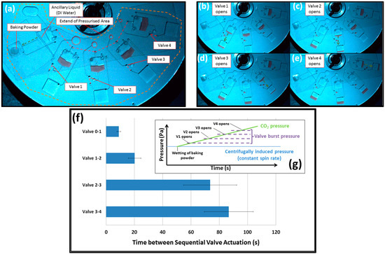 Volume governed valve actuation. (a) The baking powder is activated by the ancillary liquid (deionised (DI) water) to pressurize the interconnected cavities on the disc. Pneumatic chambers of each valve are highlighted and red dashed lines indicate connecting lower level channels (b–e). With increasing gas pressure, liquid is pumped into the dead-end pneumatic chambers (valves), successively disintegrating the DF. The order of valve actuation is governed by the compression ratio and thus the size of the pneumatic chambers; Valve 1, the largest chamber, is actuated first; (f) timing data of valve actuation (n = 6); and (g) qualitative representation of the expected gas pressure changes in the disc; the rise in the CO2 pressure has the same effect as an increase in spin rate. Note the disc was initially designed so that, in the absence of CO2, all DF burst valves will not trigger at or below 30 Hz spin rate.