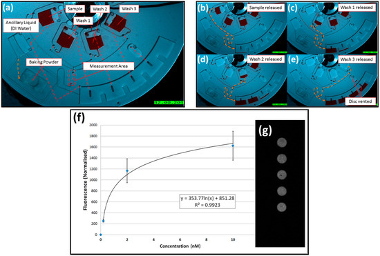 A direct DNA hybridization assay. (a–e) Visualization of the chip, using food dyes, of the sequential release of sample and washes. Note that the last DF vents the disc to atmosphere. The red dashed lines in (a) show lower level connecting channels; (f) fluorescence versus loaded sample concentration (n = 3 discs); and (g) is a representative image showing fluorescent DNA hybridization on the slide. Note the disc was initially designed so that, before the liquid-induced release of CO2, the all DF burst valves will not trigger at or below 30 Hz spin rate (see Supplementary Material Video S1).
