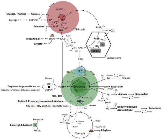 Recent emphasis on CO2 reduction and biosustainability has brought attention to photosynthetic microalgae. The microalgae, particularly cyanobacteria, are efficient organisms for producing biomass from inorganic carbon as well as important feedstocks for production of a wide range of useful compounds, including biofuels [1,2,3,4]. Cyanobacteria have the advantages of high growth rates, low nutritional requirements, and the potential for large-scale cultivation in open ponds and waters. The overall oxygenic photosynthesis process employed by cyanobacteria converts CO2 and water into an organic form of a carbon product with the assistance of light [5]. At the thylakoid membrane, cyanobacteria capture energy from sunlight in natural environments and generate the high-energy intermediates or cofactors, adenosine triphosphate (ATP) and nicotinamide adenine dinucleotide phosphate (NADP+), respectively. The ATP and NADP+ are utilized for the assimilation of essential nutrients in the Calvin–Benson cycle, in which the ribulose-1,5-bisphosphate carboxy/oxygenase enzyme (RuBisCo) located in carboxysome catalyzes CO2 fixation, as shown in Figure 1. For example, the most widely used intermediate metabolite engineers like to utilize pyruvate, the key precursor in central metabolism and product of the glycolytic pathway. “Tapping” metabolism at pyruvate allows the accumulation of large titers of ethanol [6], butanediol [7], l-lactic acid [8], d-lactic acid [9], and isobutyraldehyde [10].