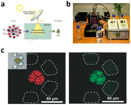 (a) Conceptual diagram of a photobioreactor [17]. The cyanobacteria convert CO2 via photosynthesis to produce useful products such as biofuel. Reproduced with permission from Nature Photonics; published by Nature Publishing Group, 2011; (b) Picture of a commercial photobioreactor produced by Photo System Instruments [15]. The reactor has a volume of 400 mL and a sensor for optical density measurement; (c) Single Botryococcus braunii (B. braunii) colony trapping in the microfluidic photobioreactor array [19]. Reproduced with permission from Lab on a chip; published by Royal Society of Chemistry, 2014. Left and right panels show the autofluorescence from cholorophyll and lipid-stained images after Nile red treatment. Reproduced with permission from Lab on a chip; published by Royal Society of Chemistry, 2012.