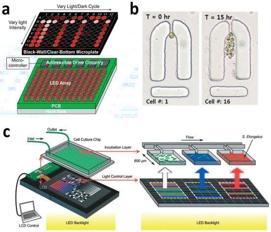 Chen et al. used a 96-well microplate integrated with a LED light source for high-throughput studies of light-dependent growth rates and characterized photosynthetic efficiency in the model organism Dunaliella tertiolecta, a lipid-producing algae as shown in Figure 3a [37]. They claimed to reduce the screening time from two years using conventional tools to less than two weeks by conducting 96 photoirradiance experiments in parallel. However, it is reported that growth of cyanobacteria in 96 well is poor as compared to 6 well plates or 24 well plates [4]. Teng et al. elucidated the mechanism for robust circadian oscillations in growing Synechococcus elongatus (S. elongates) [38]. To accomplish this, they used a single-cell chemostat based on an agarose pad [31,39] patterned with submicron grooves to monitor the oscillation of a wild-type strain and identify the role played by a transcription translation regulation (TTR) circuit in enhancement of stability of circadian clocks.