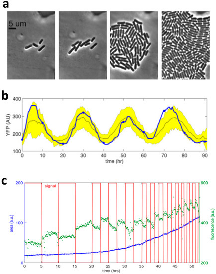 - Balagadde, F.K.; You, L.C.; Hansen, C.L.; Arnold, F.H.; Quake, S.R. Long-term monitoring of bacteria undergoing programmed population control in a microchemostat. Science 2005, 309, 137–140. [Google Scholar] [CrossRef] [PubMed]