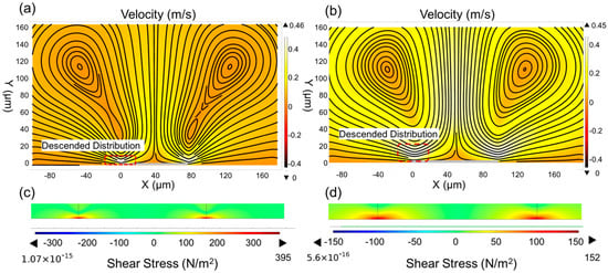 Simulated results of the 2D FEM analysis. Micro-vortices are formed under the resonator stimulation of (a) 1.5 GHz and (b) 750 MHz. The simulated shear stress induced by the flow with the excitation frequency of (c) 1.5 GHz and (d) 750 MHz.