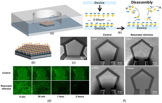(a) Schematic of the release system. The streaming flow was triggered by the stimulation of the resonator, inducing shear stress on the solid-liquid interface, and further leading to the disassembly of PET thin films; (b) Multilayered PET-coated resonator composed of HA and PLL-FITC through LbL approach; (c) SEM image of the fabricated resonator, which is comprised by a thin-film piezoelectric layer sandwiched by two metal electrodes and vibrates at 1.5 GHz; (d) Fluorescence images of the PET thin films, which were exposed to the buffer with (experiment group) or without (control group) the stimulation of the resonator; (e) Schematic process of the multilayers’ disassembly under the stimulation of the resonator; (f) SEM images of the PET thin films before and after the treatment.