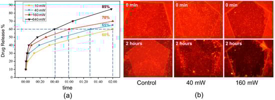 (a) DOX release under the stimulus of the resonator with different power inputs; (b) Fluorescence images of the thin films taken before and after the experiments.