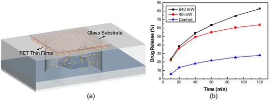Every drug molecule has a therapeutic window in terms of the concentration above which the drug is toxic and below which it is ineffective [1]. Developing controlled drug release techniques to precisely tune the dosage of drugs is a critical issue in modern medical and biotechnology research [2,3,4]. Many research interests are focused on developing a system based on molecular self-assembly approaches as novel drug carriers to realize controlled drug release [5,6], where the drug molecule is slowly released over time. Among these dedicated chemical approaches, drug carriers based on the self-assembly of polyelectrolytes (PETs) through layer-by-layer (LbL) techniques are one of the most promising methods, in which multilayered thin film is established by alternating the assembly of oppositely charged PETs on surfaces or in solutions [7,8,9]. Drug molecules can be incorporated directly during the LbL assembly process or absorbed into the nanoporous PET films after the LBL approach [10]. It is a very simple and reliable technique as the architectures of the thin films can be well controlled at nanometer precision; thus, the amount of the drug molecules loaded can be precisely determined. The drug release can be controlled by an external stimulus to trigger the disassembly of the PETs, such as pH [11,12,13], electrochemistry [14,15,16], temperature [17,18,19], or light [20,21,22]. However, these methods are limited by either chemical properties of the PET systems or specifications on the operating environment. For practical applications, it is desired to develop methods which are not limited by the chemical properties of the system or the environment, and with low power consumption.