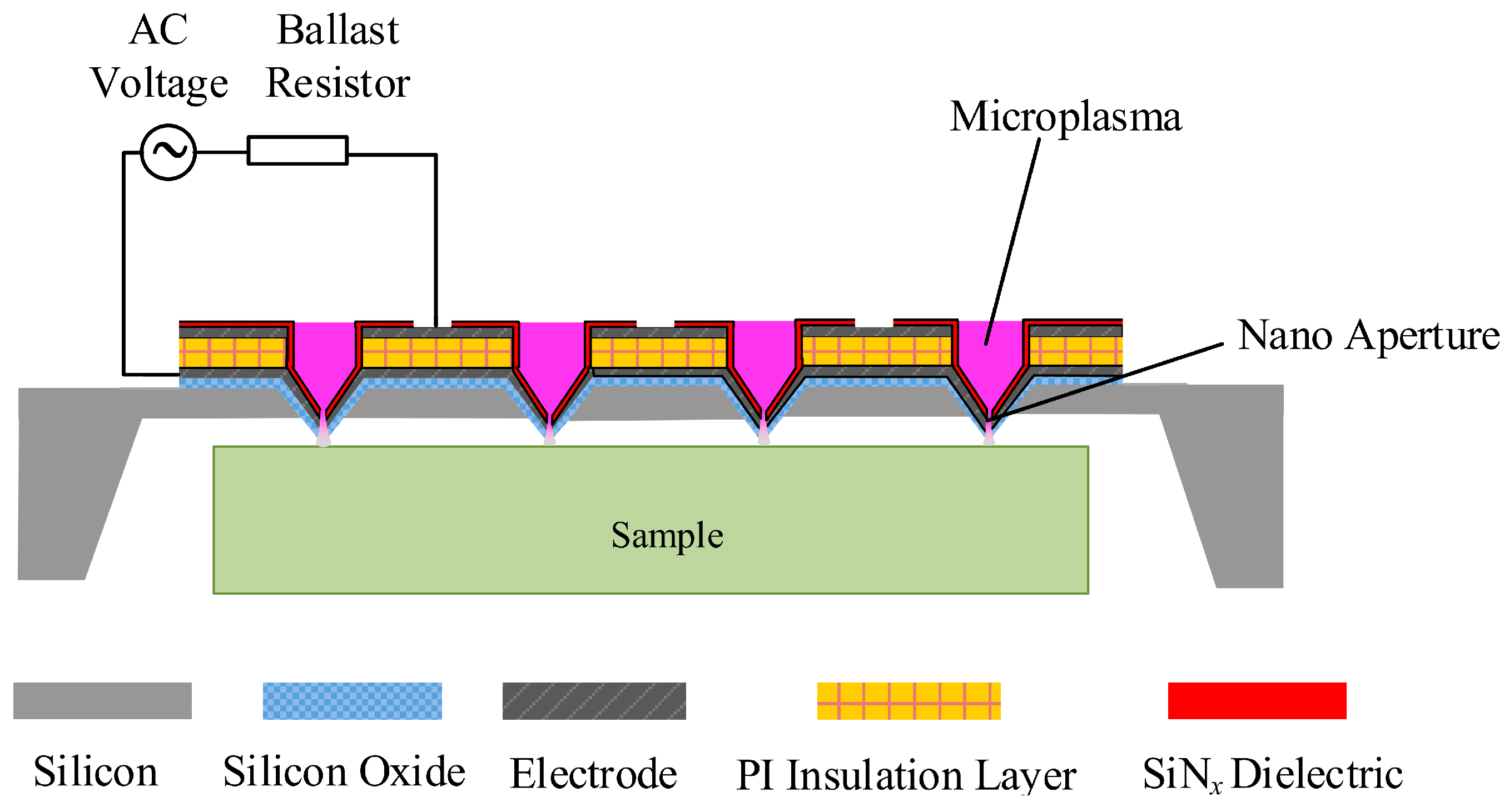 Due to its long lifetime and prevention from glow-to-arc transition, micro dielectric barrier discharge (MDBD) has wide applications, such as UV light source [1], surface modification [2,3], environmental issues [4], synthesis and etching of materials [5,6], biomedical [7], etc. Among these applications, various maskless material etching and synthesis applications have been reported [8,9,10,11,12]. As reported by Guo et al. [13], maskless etching of polymer films was realized by using an atmospheric pressure air microplasma jet. The plasma jet has the advantages of simple structure and operability under atmospheric pressure. However, at hundreds of micrometers, the etching resolution is not high, and it can only etch a single point with low efficiency. Yang et al. [14] used a paper-based microplasma array to perform maskless patterning of poly(ethylene oxide)-like thin films with a feature size down to the submillimeter scale. This microplasma device is low-cost and flexible, but the resolution is not high enough. Recently, the authors’ group proposed a novel maskless nanoscale etching method based on an inverted pyramid MDBD array. As shown in Figure 1, inverted pyramid MDBD devices are integrated into a scanning probe hollow tips array with nano-apertures at the tips. When an AC voltage is applied between the two electrodes, the microplasmas generated inside the microcavity near atmospheric pressure will eject from nano-apertures for maskless nano etching. This method has the advantages of being maskless, having high resolution, high efficiency, and low cost. The MDBD device is a multilayer structure with a structural layer, a lower electrode, an insulation layer, an upper electrode, and a dielectric layer. The selection of the dielectric barrier layer material of MDBD devices is one of the key factors, as it can prevent the electrode from being bombarded by the plasma and then sustain the high density plasmas with long lifetime. Because it possesses good dielectric, chemical resistance, and process compatibility qualities [15,16,17], SiNx is one of the most favorable dielectric barrier layer materials in MDBD devices. There are several ways to prepare SiNx films, such as direct nitridation [18], thermal evaporation [19], radio frequency (RF) sputtering [17], low pressure chemical vapor deposition (LPCVD) [16], and plasma enhanced chemical vapor deposition (PECVD) [20]. In addition to the advantage of depositing material at a relatively lower temperature, PECVD can produce a film with adjustable stress by tuning process parameters. However, the SiNx film deposited on multilayer films by regular PECVD recipe may have cracks or wrinkles when the thickness reaches a certain value, ascribed to the residual stress-induced deformation of multilayer films.