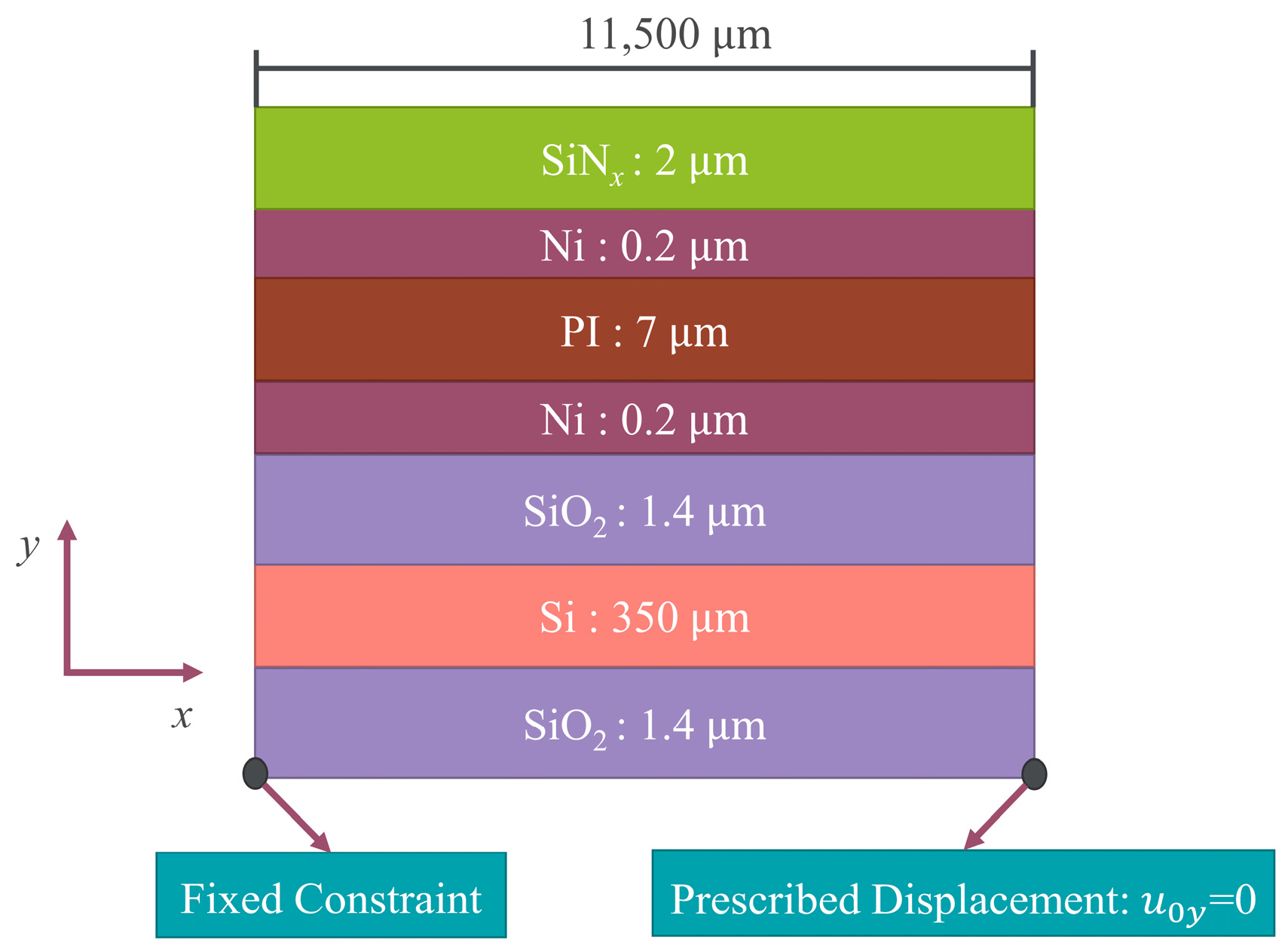 A 2D geometry of the multilayer thin films plate (Figure 2) based on COMSOL 5.1 (Comsol Multiphysics GmbH, Gottingen, Germany) was used with the plane stress approximation for numeric efficiency (no stress in the direction of thickness). Here the bottom-left corner of the multilayer plate was fixed, and the bottom-right corner of the plate was constrained in the y direction, which prevents rigid-body movements but did not affect the stress distribution. The analysis used two steps: first, the Si substrate layer, SiO2 layer, Ni layer, and PI layer were active. The SiNx film was not active in this step. In step two, all seven layers were active, and the temperature was dropped from 300 °C to room temperature (20 °C). The residual stresses (Table 1) of each layer were used as initial stresses in the simulation process. Then, the residual stress of device could obtain after coupling the thermal stresses by setting the temperature change in the thermal expansion interface. Other basic material properties, such as density, Poisson’s ratio, Young’s modulus, and coefficient of thermal expansion (CTE) are also shown in Table 1. The layer thicknesses and the size of the plate are shown in Figure 2.