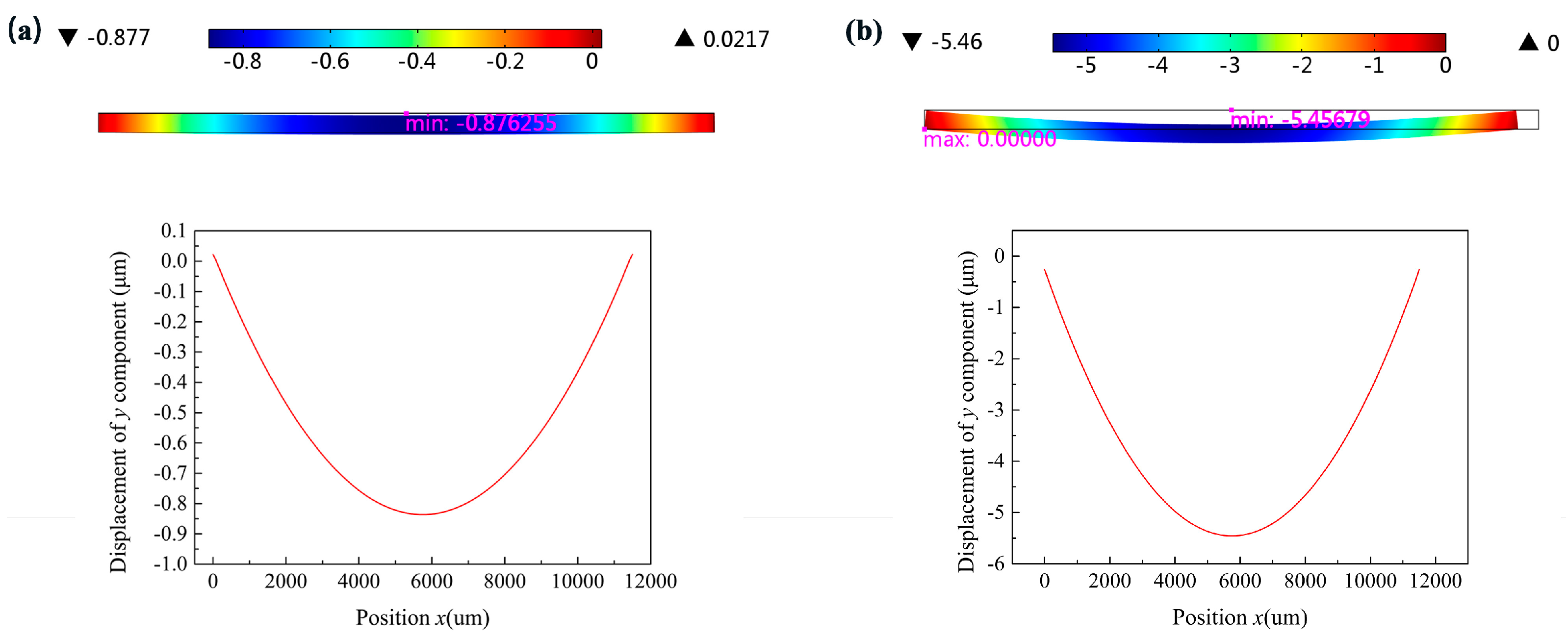 Displacement profiles of y component of the multilayer thin films. (a) Before deposition of SiNx; (b) After deposition of SiNx film by plasma enhanced chemical vapor deposition (PECVD) with the original recipe (Plasma System100, Oxford Instruments).