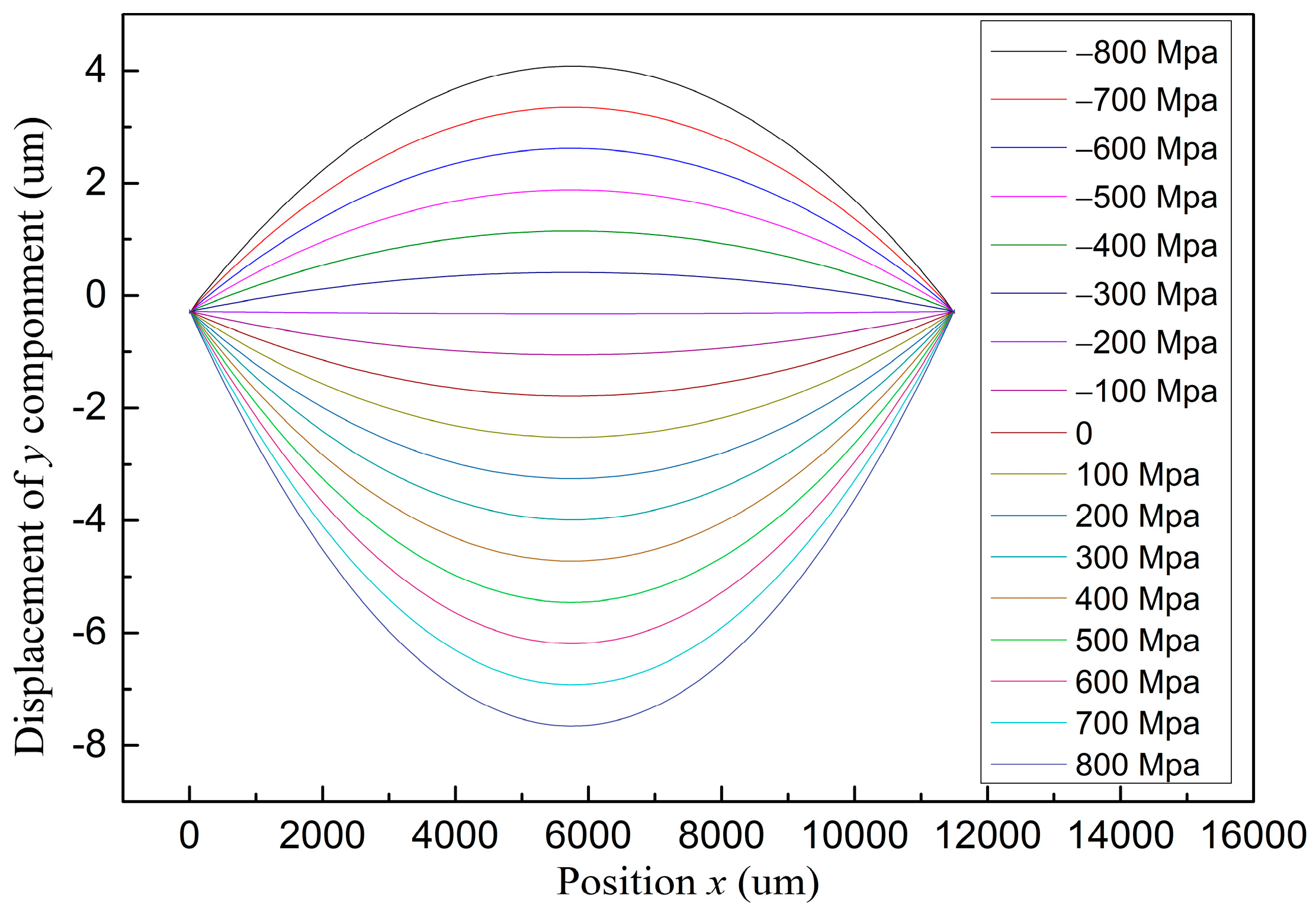 Displacement profiles of y component of the multilayer thin films under intrinsic stresses of SiNx film ranging from −800 MPa compressive stress to 800 MPa tensile stress, with stress increment of 100 MPa.